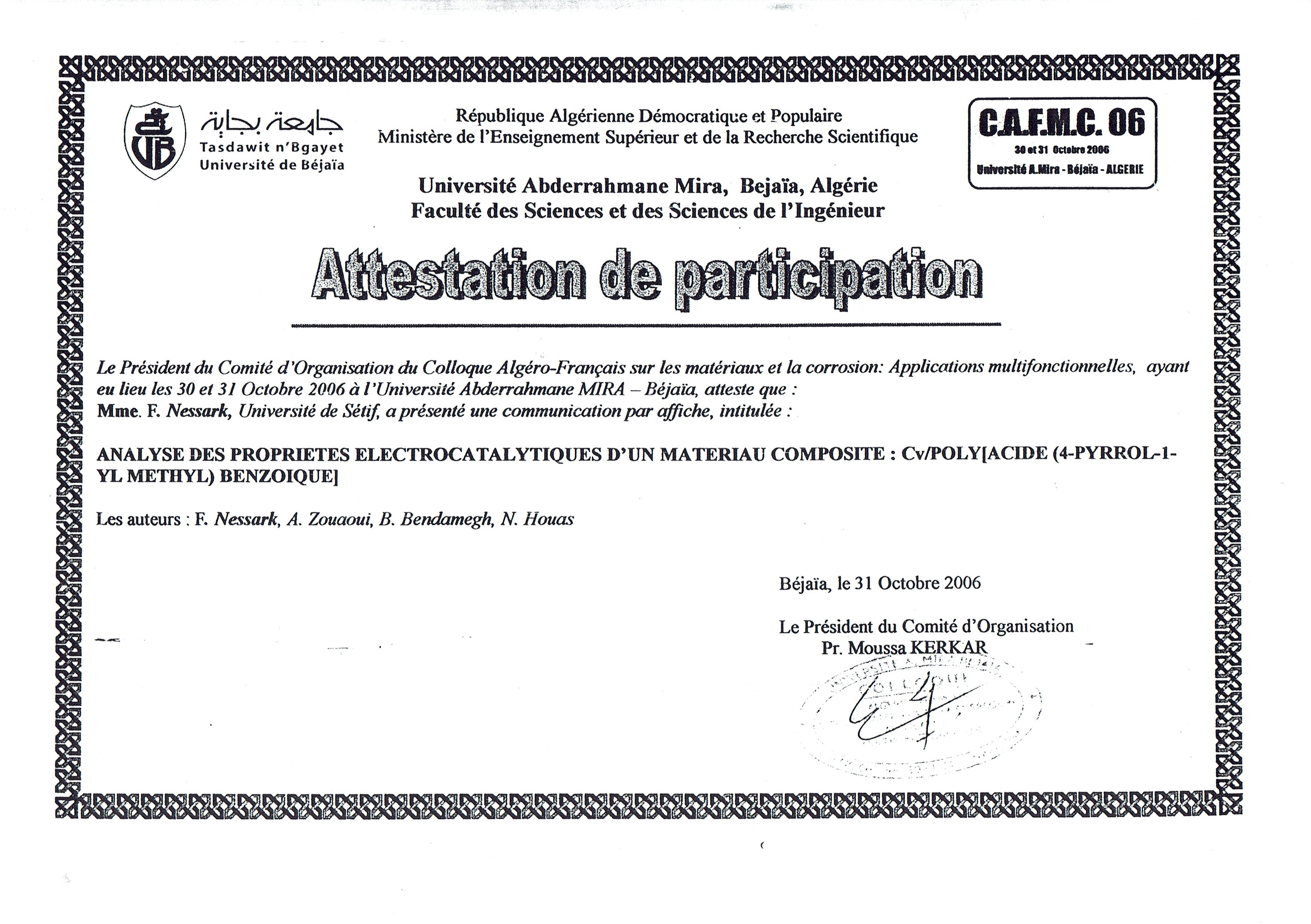 M. NESSARK Faiza, A. ZOUAOUI, B. NESSARK, B. BENDEMAGH, N. HOUAS, , (2007), "Utilisation d’un matériau composite : Cv/poly[acide(4-pyrrol-1-yl méthyl) benzoïque] pour la récupération électrochimique de métaux de transition", [international] Congrès International sur l'Environnement (CIE’2007) , Ghardaïa, Algérie