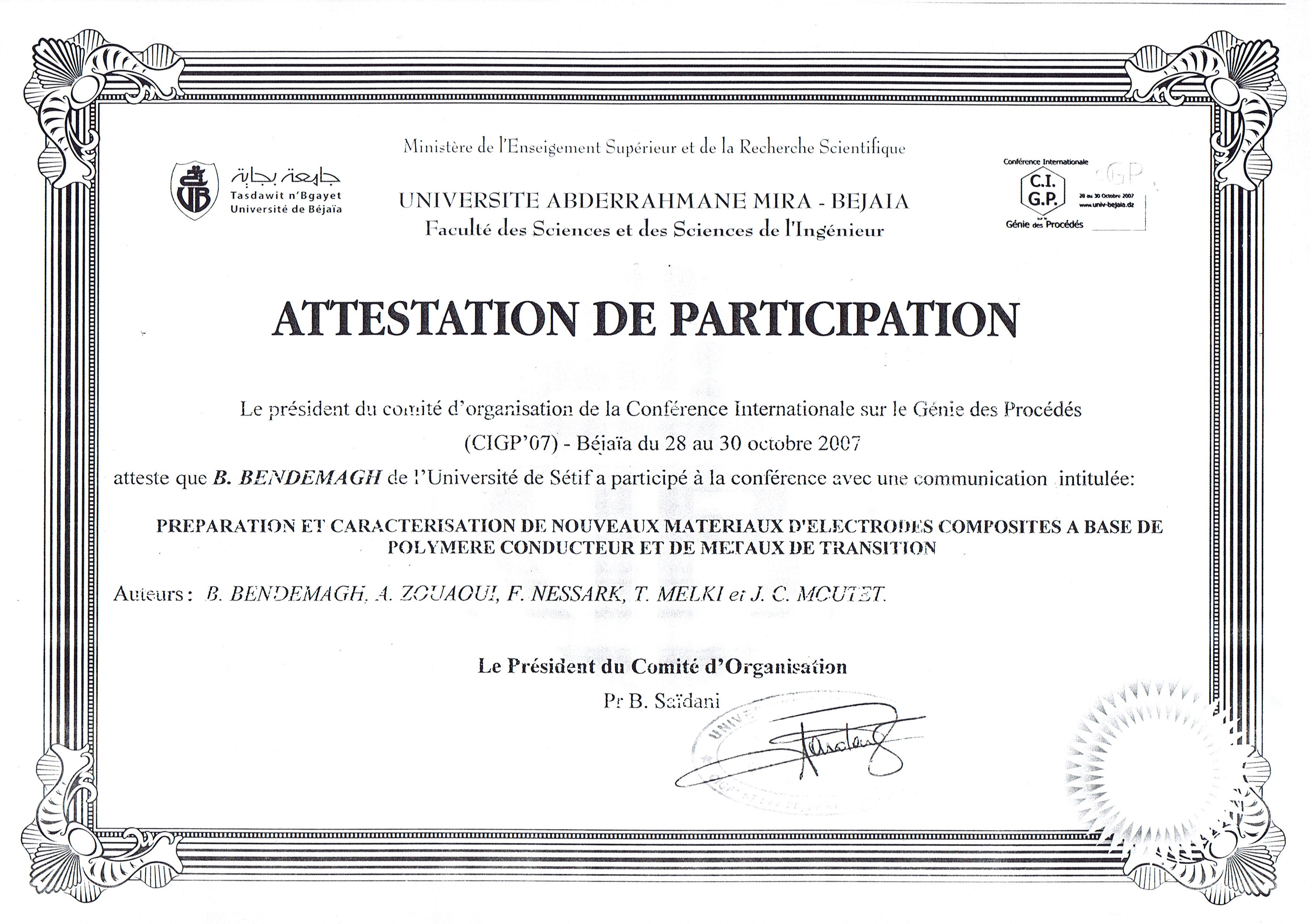 M. NESSARK Faiza, B. BENDEMAGH, A. ZOUAOUI, T. MELKI, J-C.MOUTET, , (2007), "Préparation et caractérisation de nouveaux matériaux d'électrodes composites à base de polymère conducteur et de métaux de transition.", [national] Conférence Internationale sur le Génie des Procédés (CIGP’2007) , Béjaia, Algérie