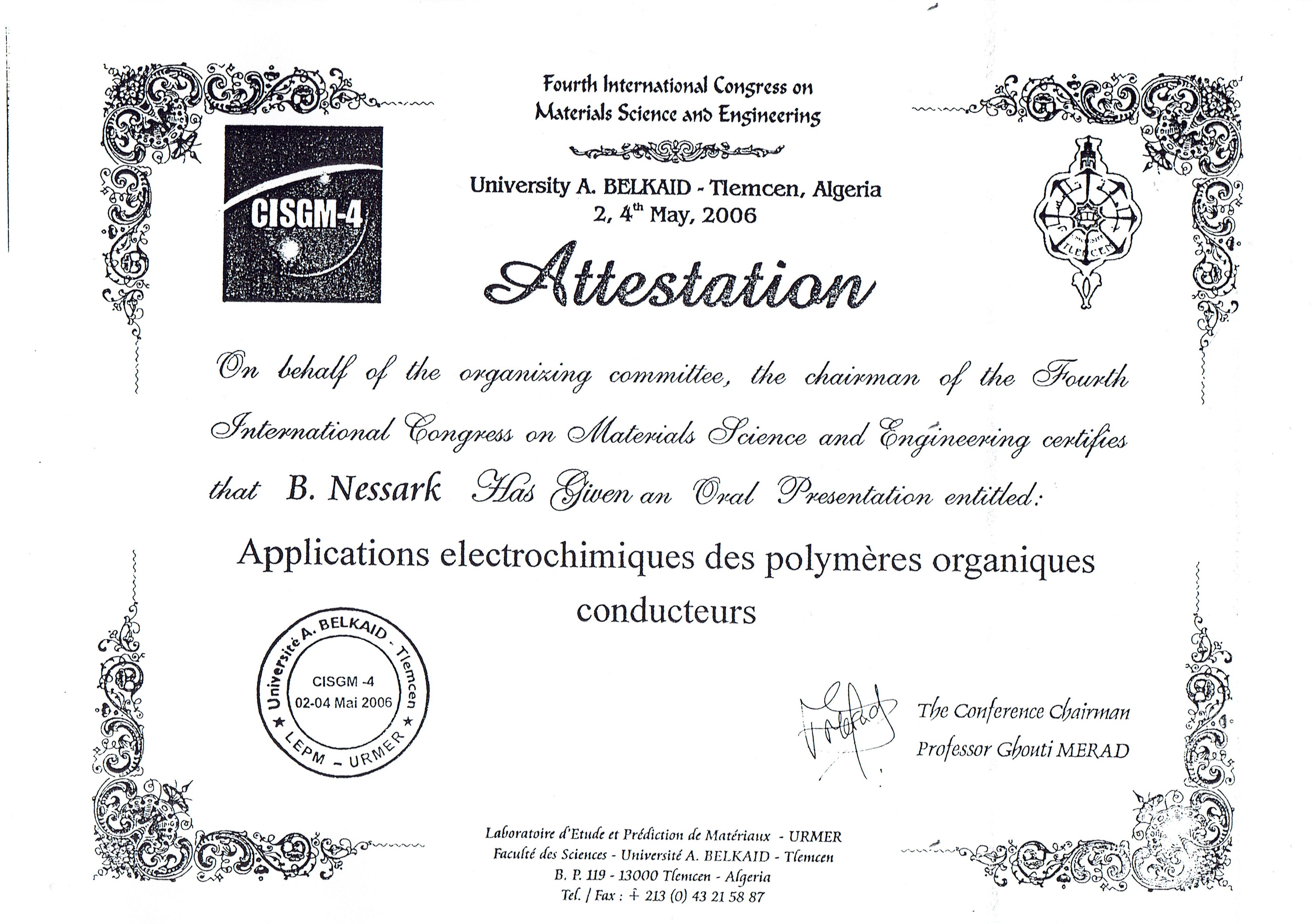 M. NESSARK Faiza, B. NESSARK, A. OUCHENE, A. BAHLOUL, N. MAOUCHE, , (2006), "Applications électrochimiques des polymères organiques.", [international] Fourth International Congress on Materials Science and Engineering (CISGM’2006) , Tlemcen, Algérie