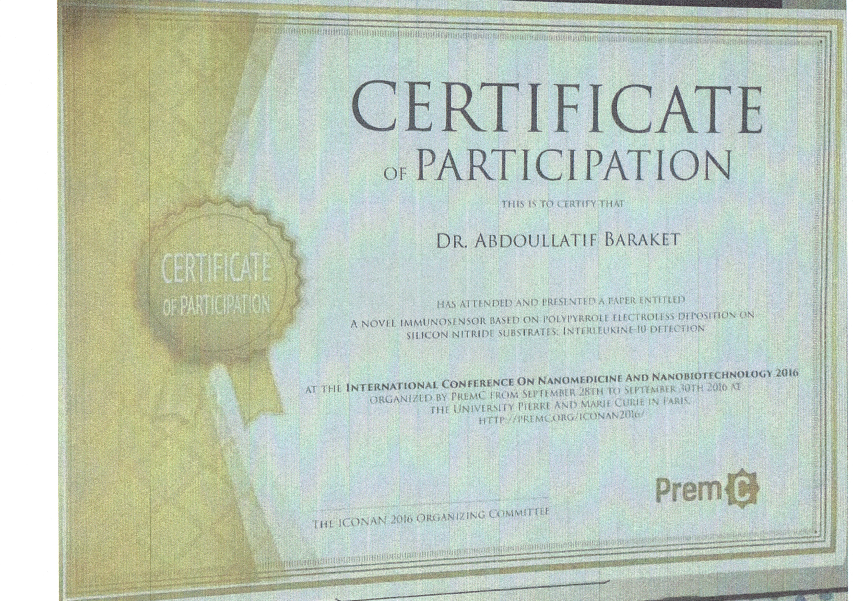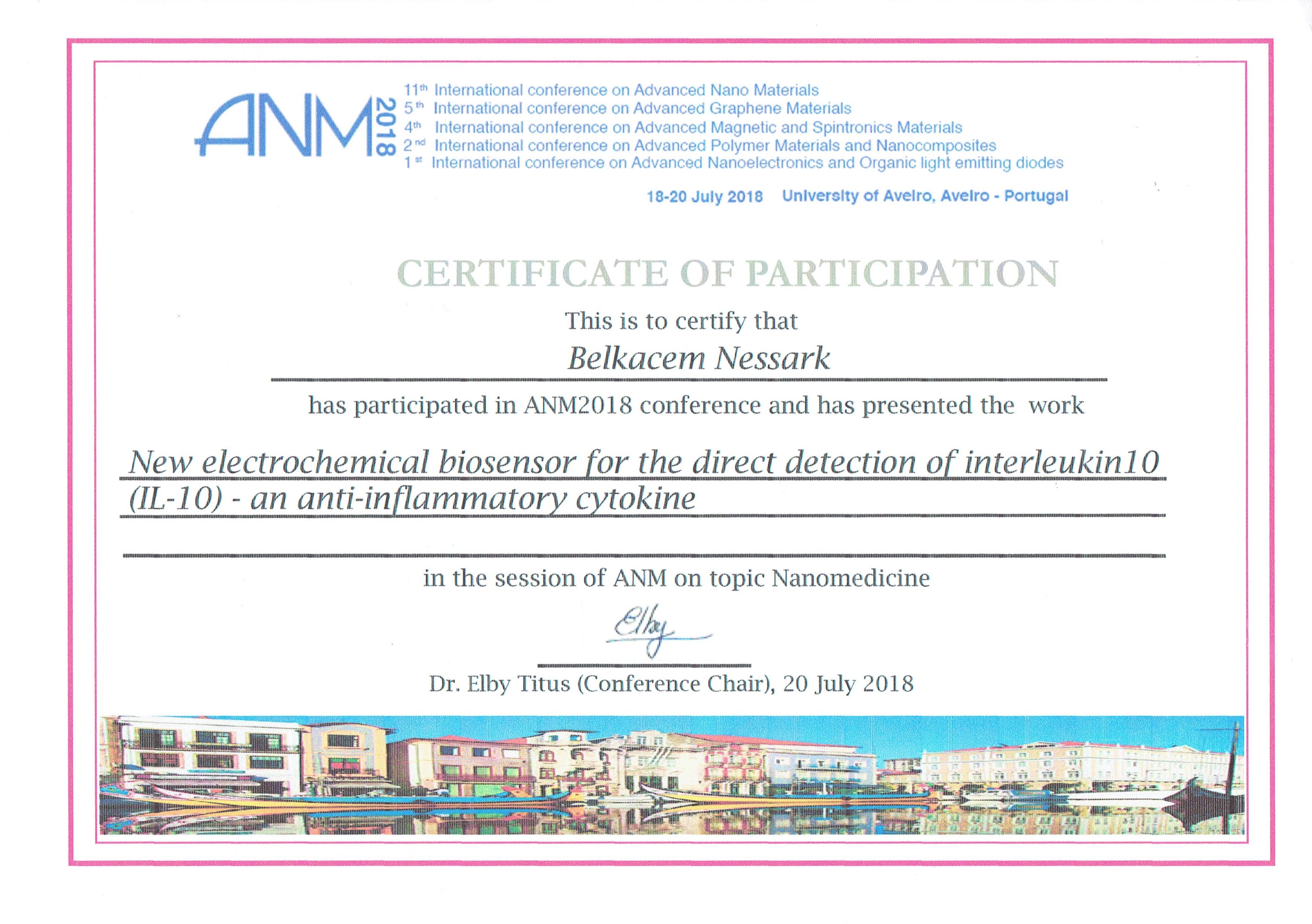 M. NESSARK Faiza, A. ZOUAOUI, B. NESSARK, A. ERRACHID, , (2018), "New electrochemical biosensor for the direct detection of interleukin-10 (IL-10) - an anti-inflammatory cytokine", [international] 11th International conference on Advanced Nanomaterials (ANM’2018) , Aveiro, Portugal