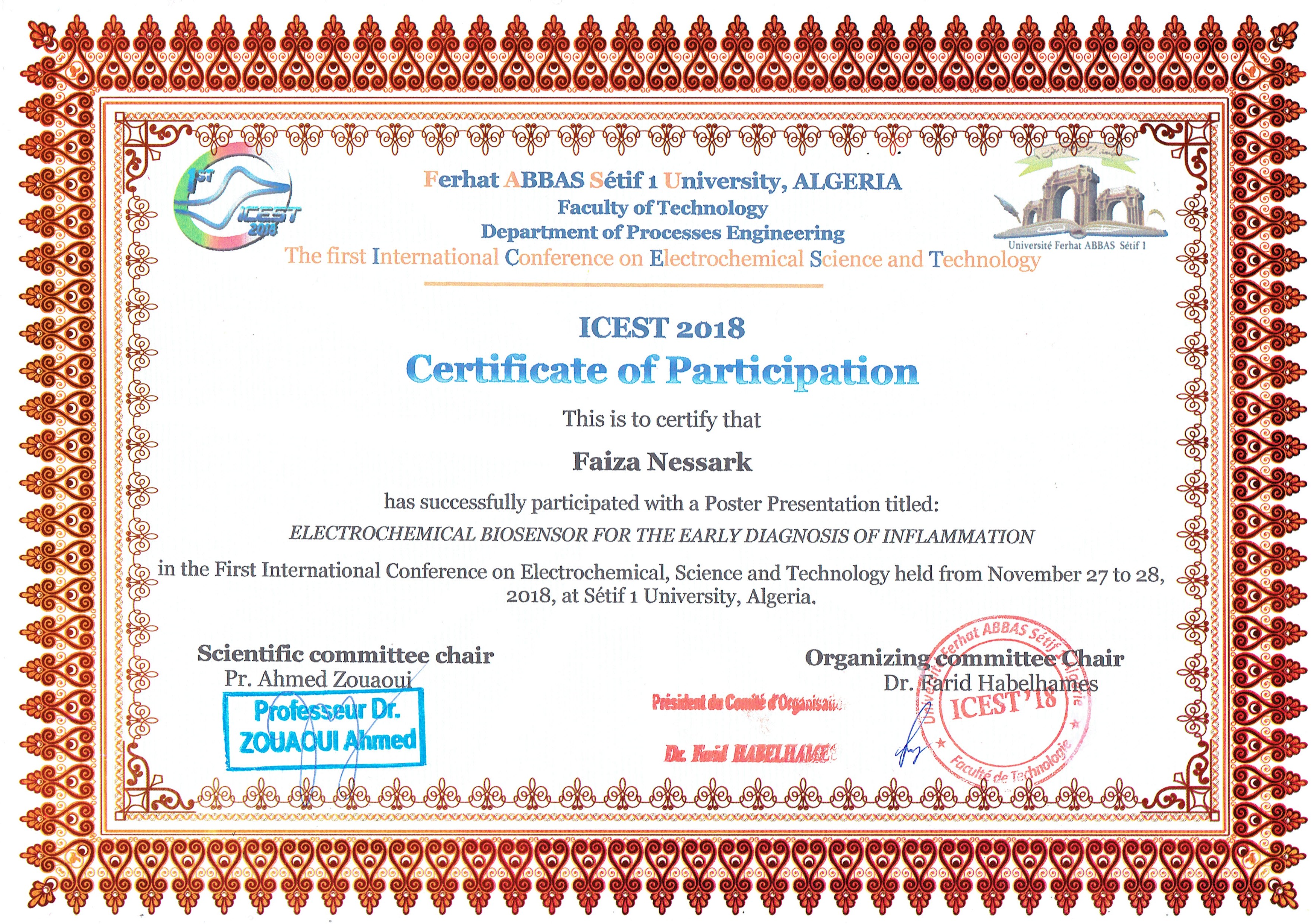 M. NESSARK Faiza, M. EISSA, N. ZINE, B. NESSARK, A. ZOUAOUI, A. ERRACHID, , (2018), "Electrochemical biosensor for the early diagnosis of imflammation", [international] first International Conference on Electrochemical Science and Technology (ICEST’2018) , Sétif, Algérie