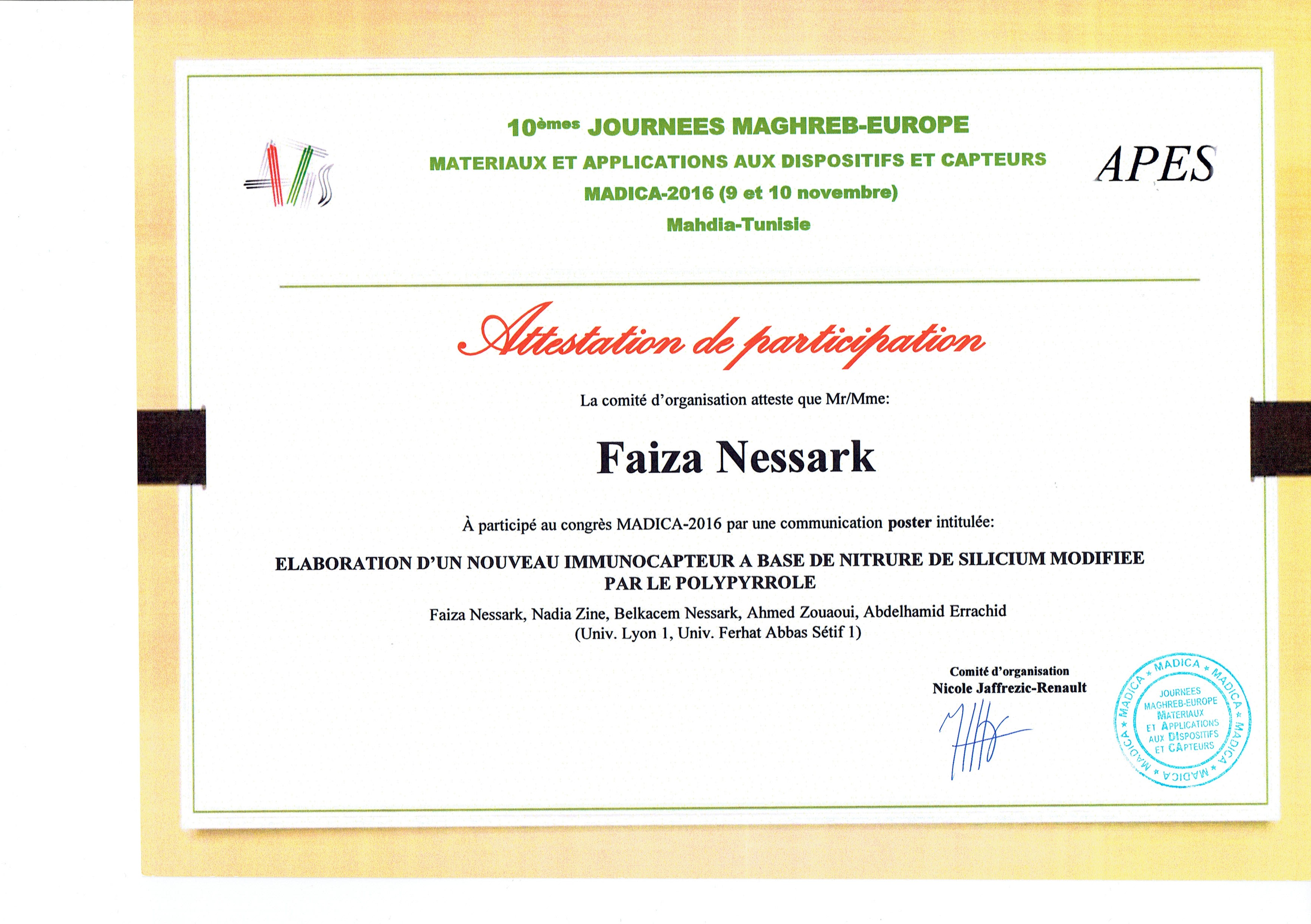 M. NESSARK Faiza, N. ZINE, B. NESSARK, A. ZOUAOUI, A. ERRACHID, , (2016), "Elaboration d’un nouveau immunocapteur a base de nitrure de silicium modifiée par le polypyrrole", [international] 10èmes Journées Maghreb-Europe ; Matériaux et Applications aux Dispositifs et Capteurs (MADICA’2016) , Mahdia, Tunisie