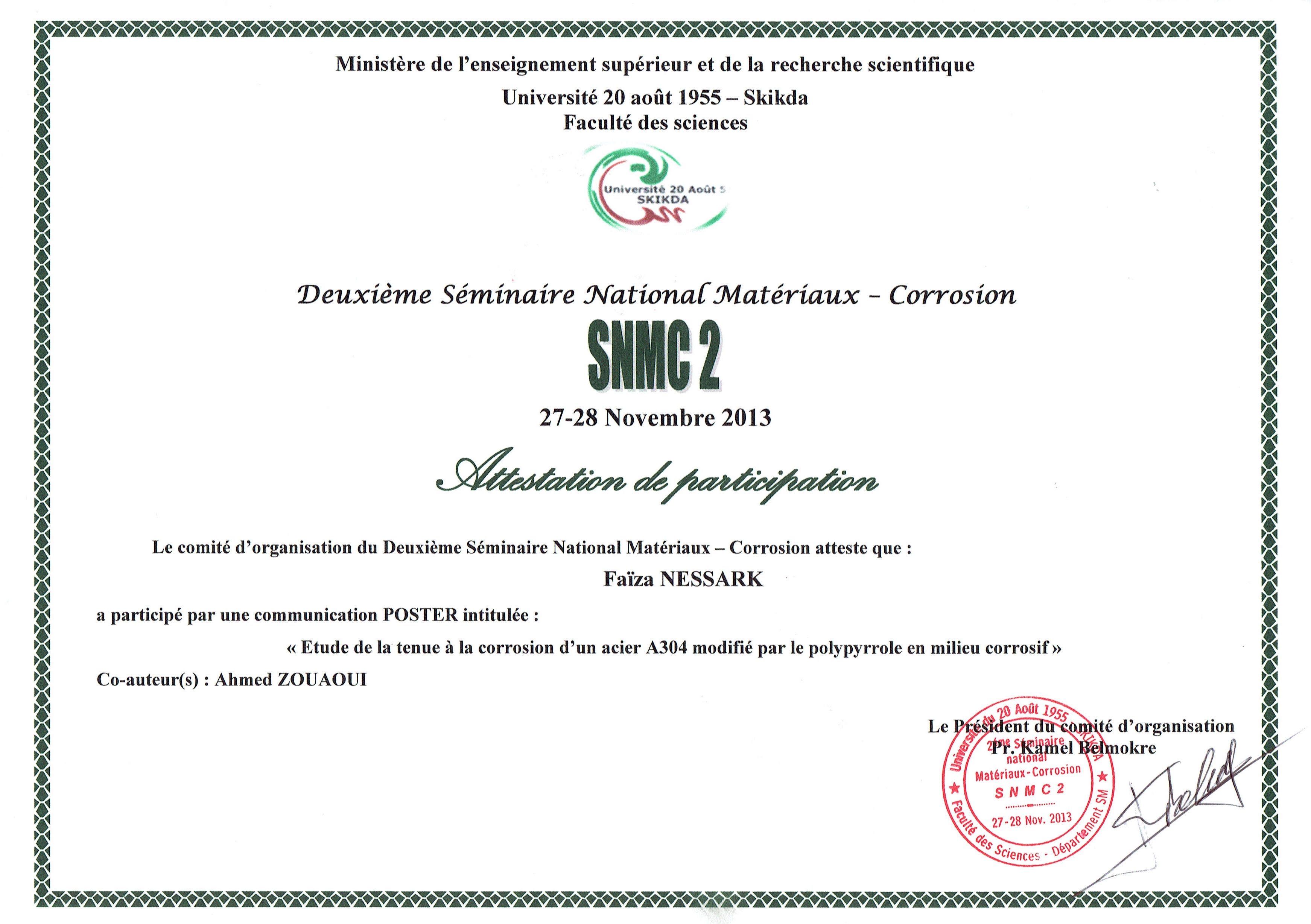 M. NESSARK Faiza, A. ZOUAOUI, , (2013), "Etude de la tenue à la corrosion d’un acier A304 modifie par le polypyrrole en milieu corrosif", [national] Deuxième Séminaire National Matériaux – Corrosion (SNMC’2013) , Skikda, Algérie
