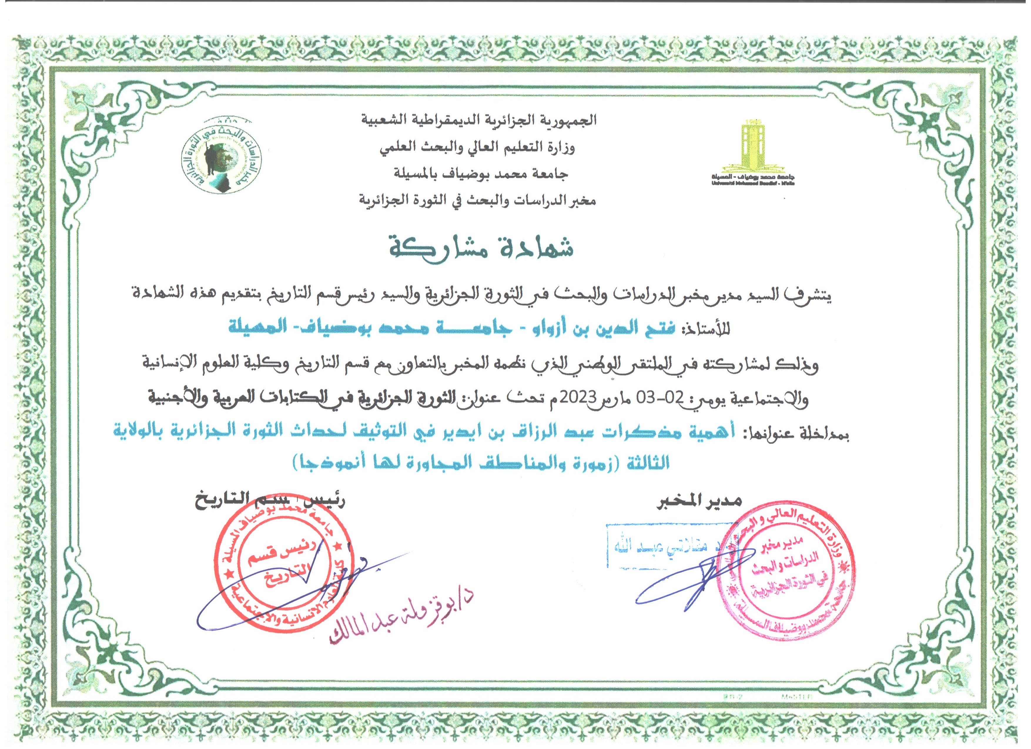 M. BENAZOUAOU Fateheddine, (2023-03-02), "أهمية مذكرات عبد الرزاق بن إيدير في التوثيق لأحداث الثورة الجزائرية", [national] الثورة الجزائرية في الكتابات العربية والأجنبية , جامعة المسيلة