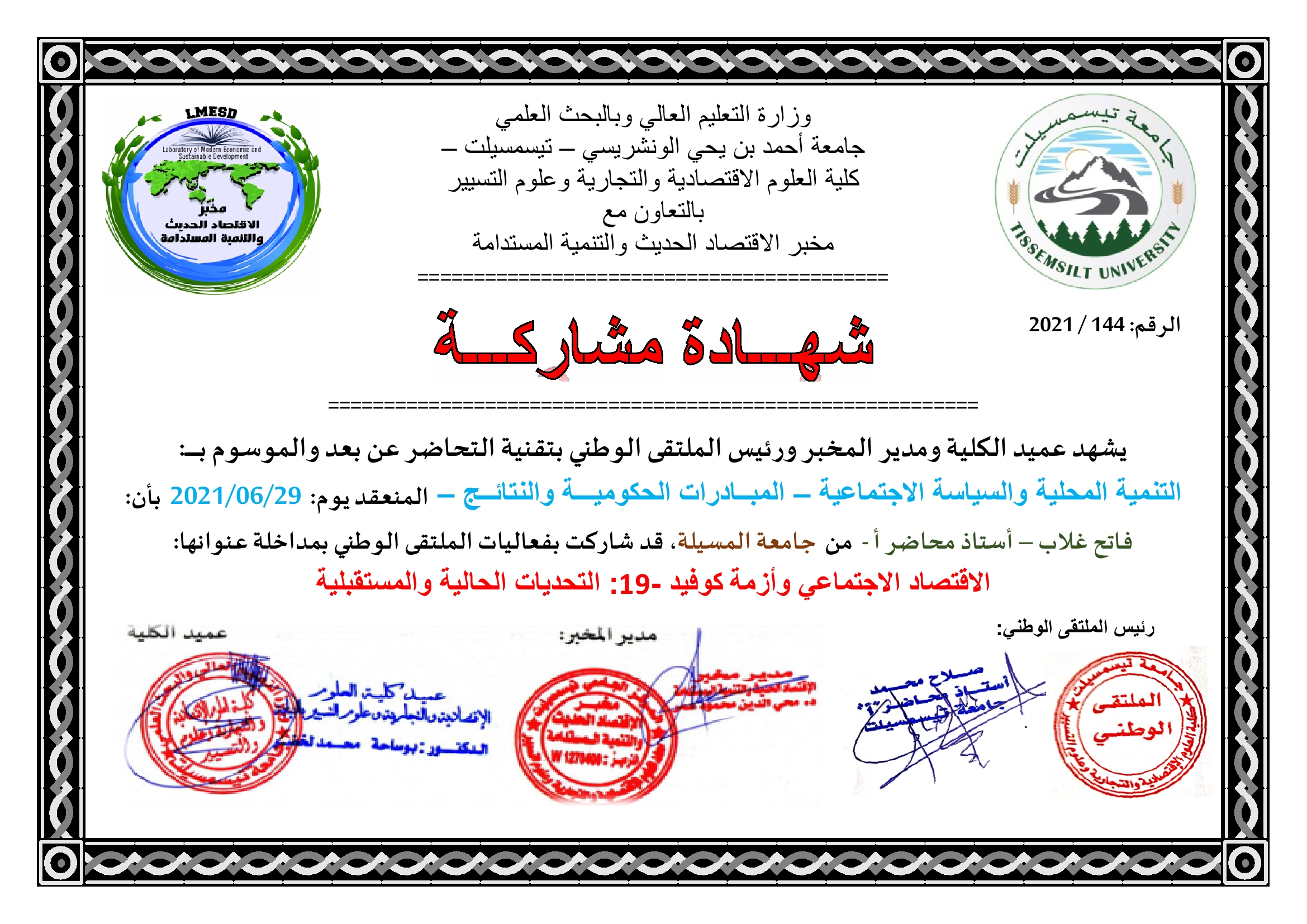 M. GHELAB Fatih, (2021), "الاقتصاد الاجتماعي وأزمة كوفيد -19: التحديات الحالية والمستقبلية", [national] التنميــة المحليـــة والسياســة الاجتماعيــة – المبــادرات الحكوميـــة والنتائــج , جامعة أحمد بن يحيىالونشريسي تيسمسيلت
