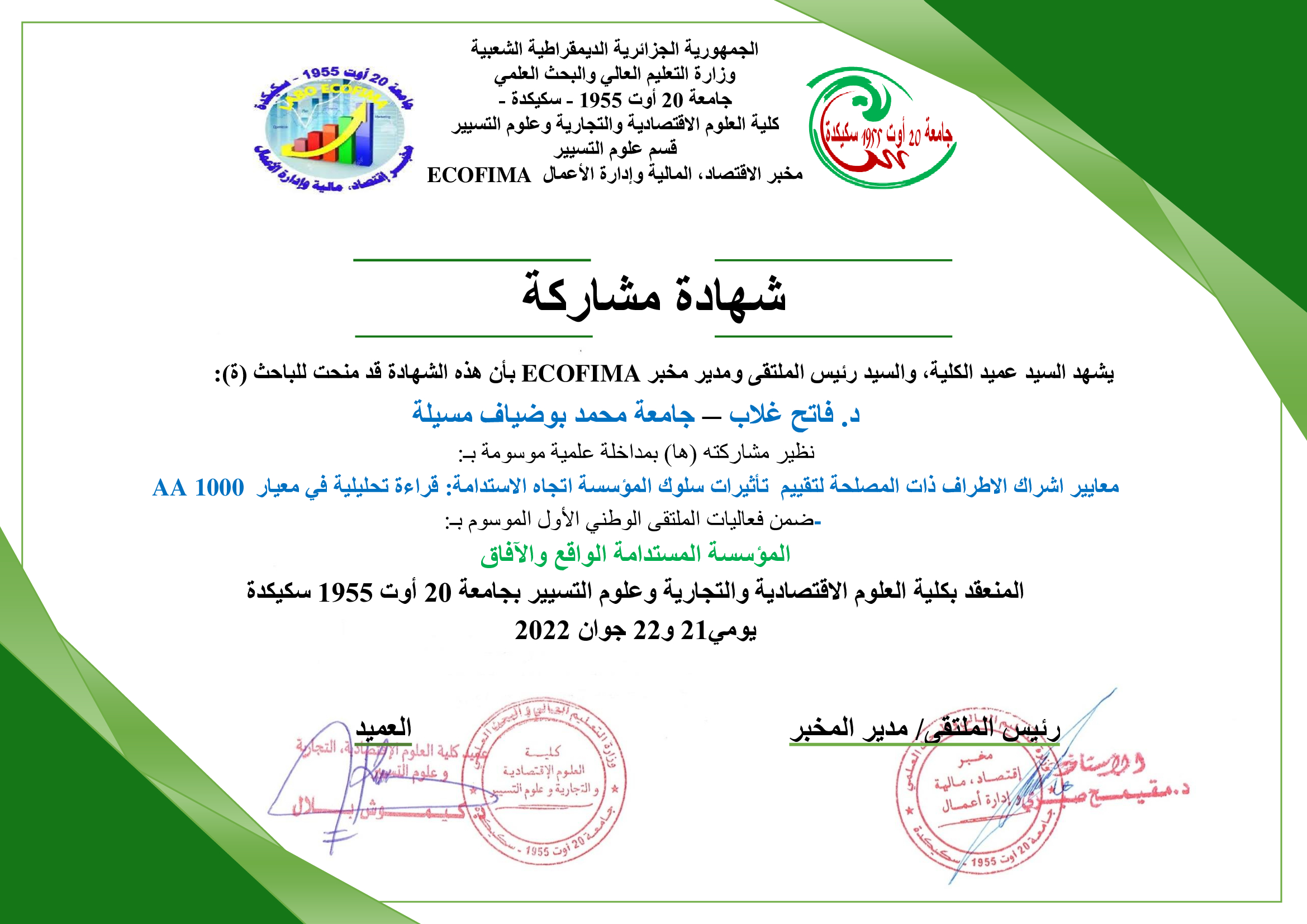 M. GHELAB Fatih, (2022), "معايير اشراك الاطراف ذات المصلحة لتقييم تأثيرات سلوك المؤسسة اتجاه الاستدامة: قراءة تحليلية في معيار AA 1000", [national] المؤسسة المستدامة الواقع ... والأفاق , جامعة 20 أوت 1955 سكيكدة