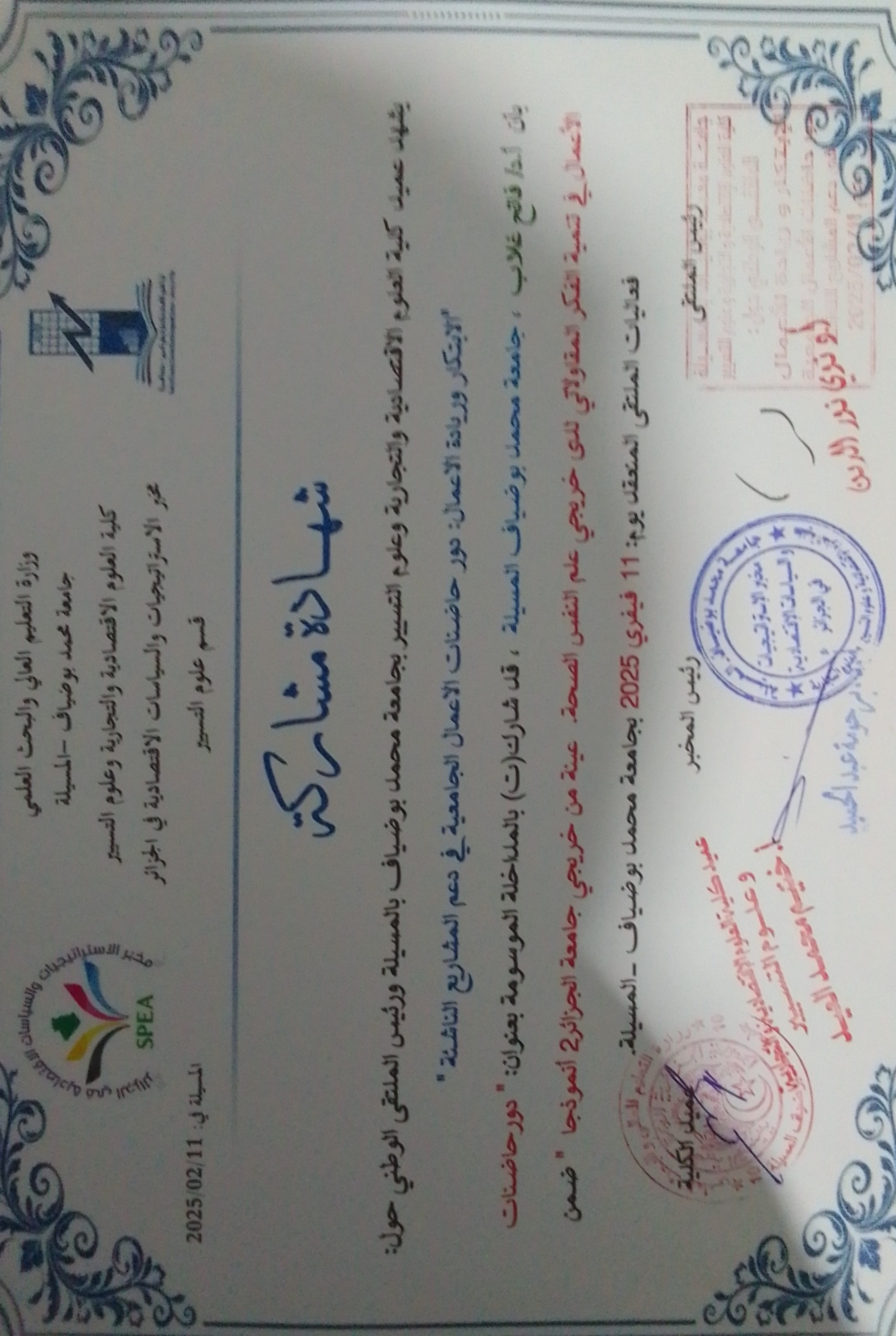 M. GHELAB Fatih, (2025-02-11), "دور حاضنة الاعمال في تنمية الفكر المقاولاتي", [national] فاتح غلاب , جامعة المسيلة