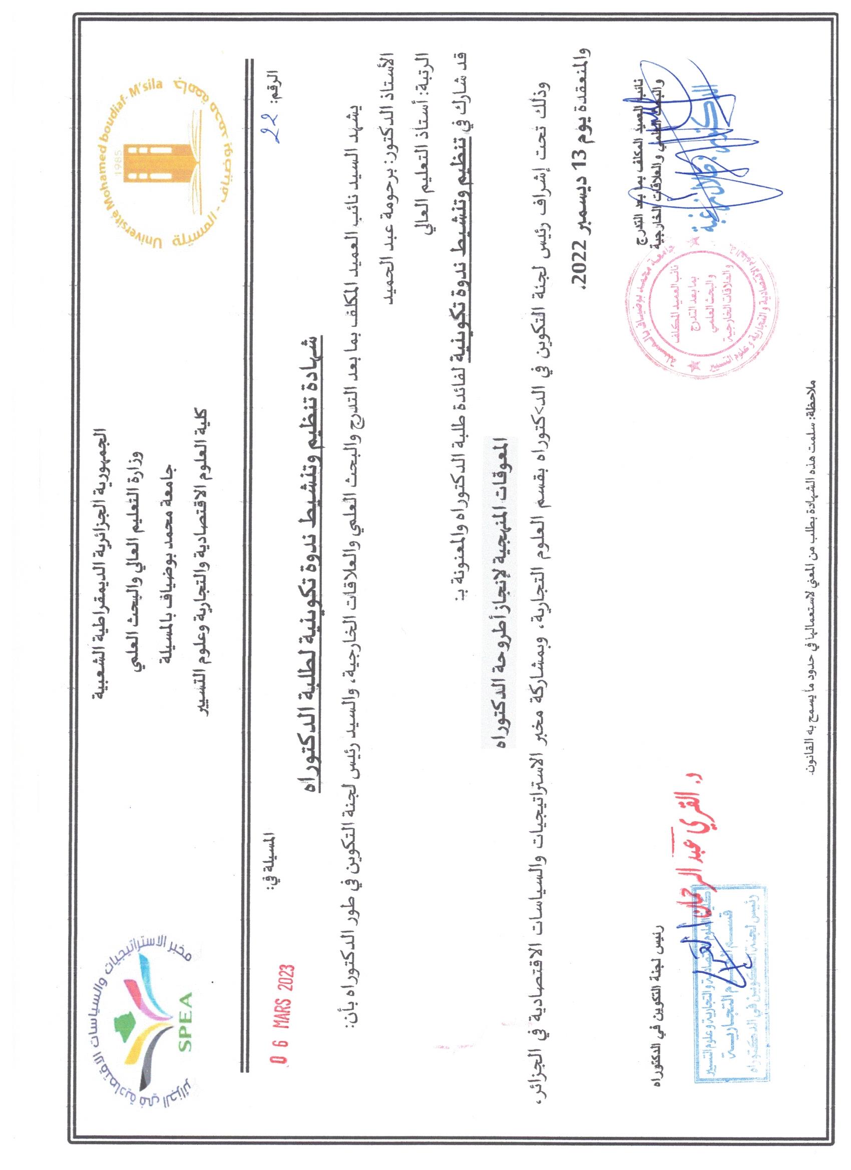 M. BERREHOUMA Abdelhamid, (2022-12-13), "المعوقات المنهجية لإنجاز أطروحة دكتوراه", [national] ندوة تكوينية لطلبة الدكتوراه , قسم العلوم التجارية بالتعاون مع المخبر