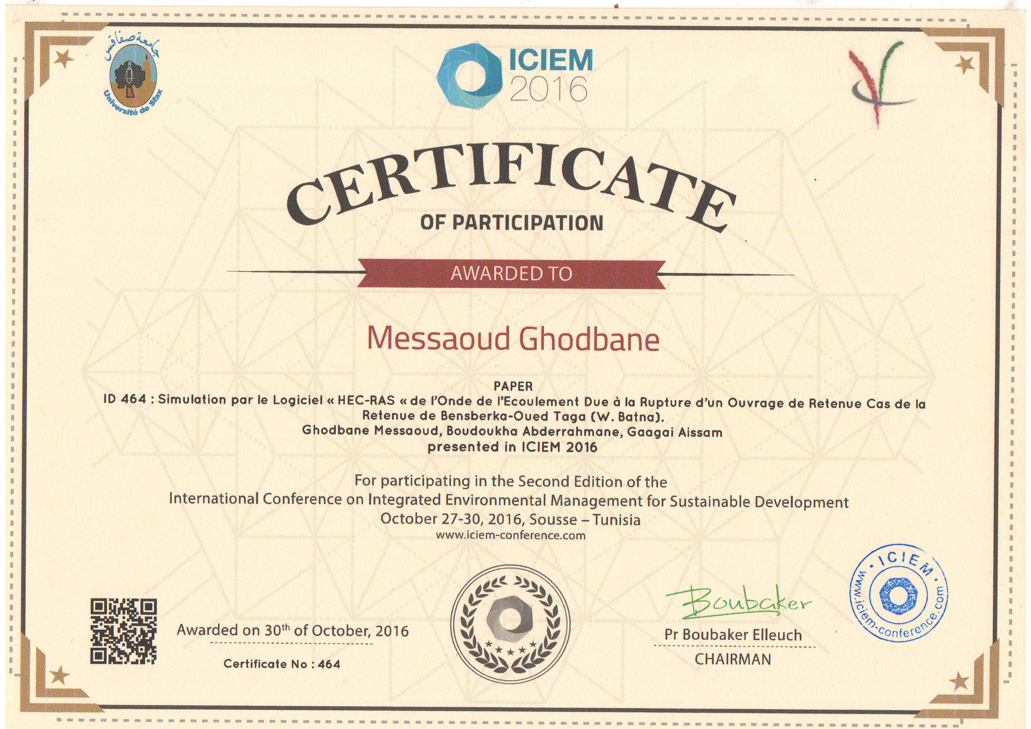 M. GHODBANE Messaoud, GAAGAI AISSAM, BOUDOUKHA ABDERRAHMANE, ghodbanemessaoud.ghadbane@univ-msila.dz, , (2016), "Differential damage assessment due to dam fallure.", [international] International conference on integrated environmental management for sustainable development 27-30/10/2016-Sousse- Tunisia (ICIEM). , Sousse- Tunisia