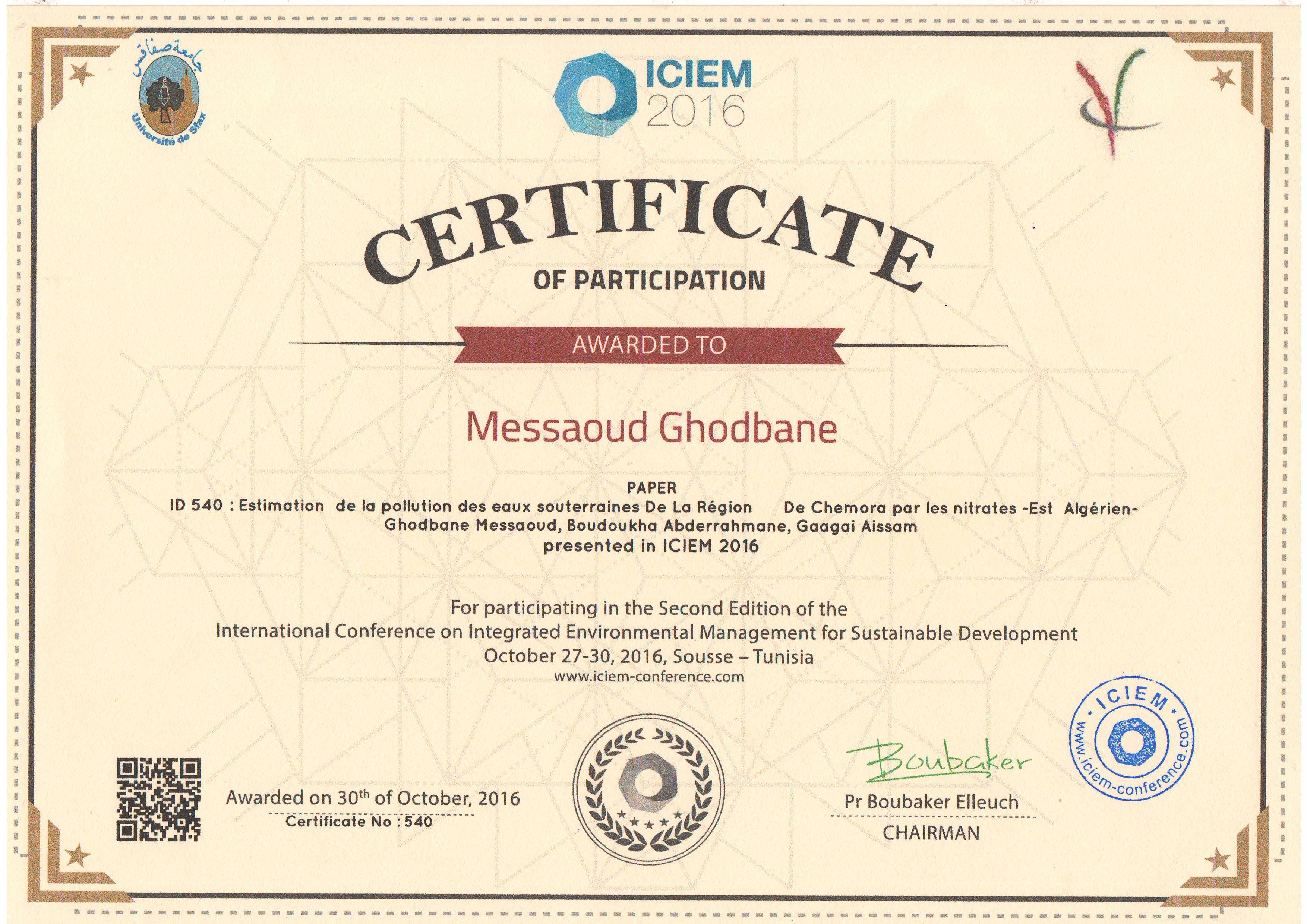 M. GHODBANE Messaoud, Abderrahmane Boudoukha, Aissam Gaagai, , (2016), "Estimation de la pollution des eaux souterraines De La Région De Chemora par les nitrates -Est Algérien-", [international] International conference on integrated environmental management for sustainable development (ICIEM) , Sousse- Tunisia