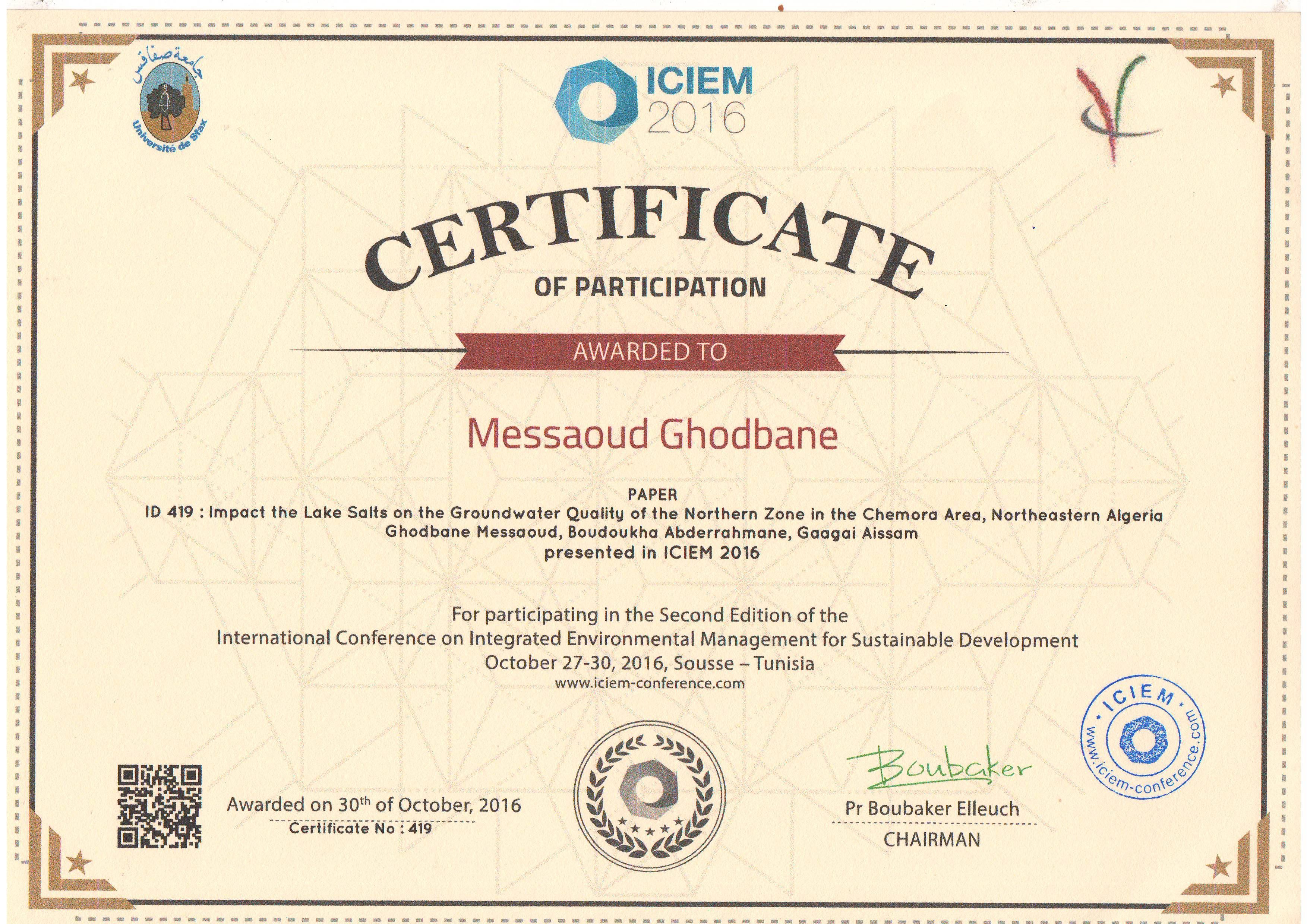 M. GHODBANE Messaoud, Abderrahmane Boudoukha, Aissam Gaagai, , (2016), "Impact the Lake Salts on the Groundwater Quality of the Northern Zone in the Chemora Area, Northeastern Algeria", [international] International conference on integrated environmental management for sustainable development (ICIEM) , Sousse-Tunisia