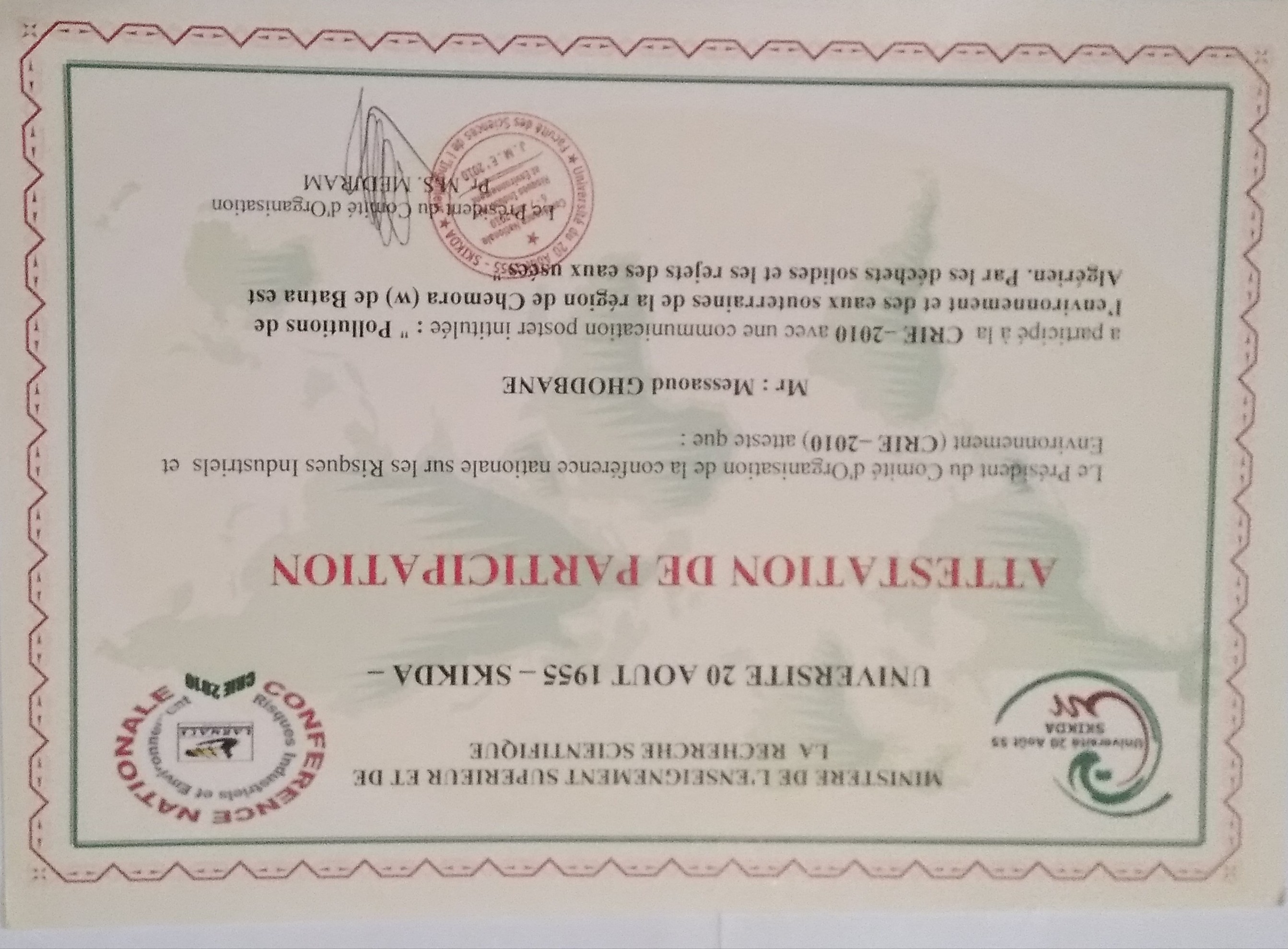 M. GHODBANE Messaoud, (2010), "La pollution de l’environnement et des eaux souterraines de la Région de Chemora par les déchets solides et les rejets des eaux usées.", [national] Conférence nationale sur les risques Industriel et Environnement(CIE-2010) , Skikda