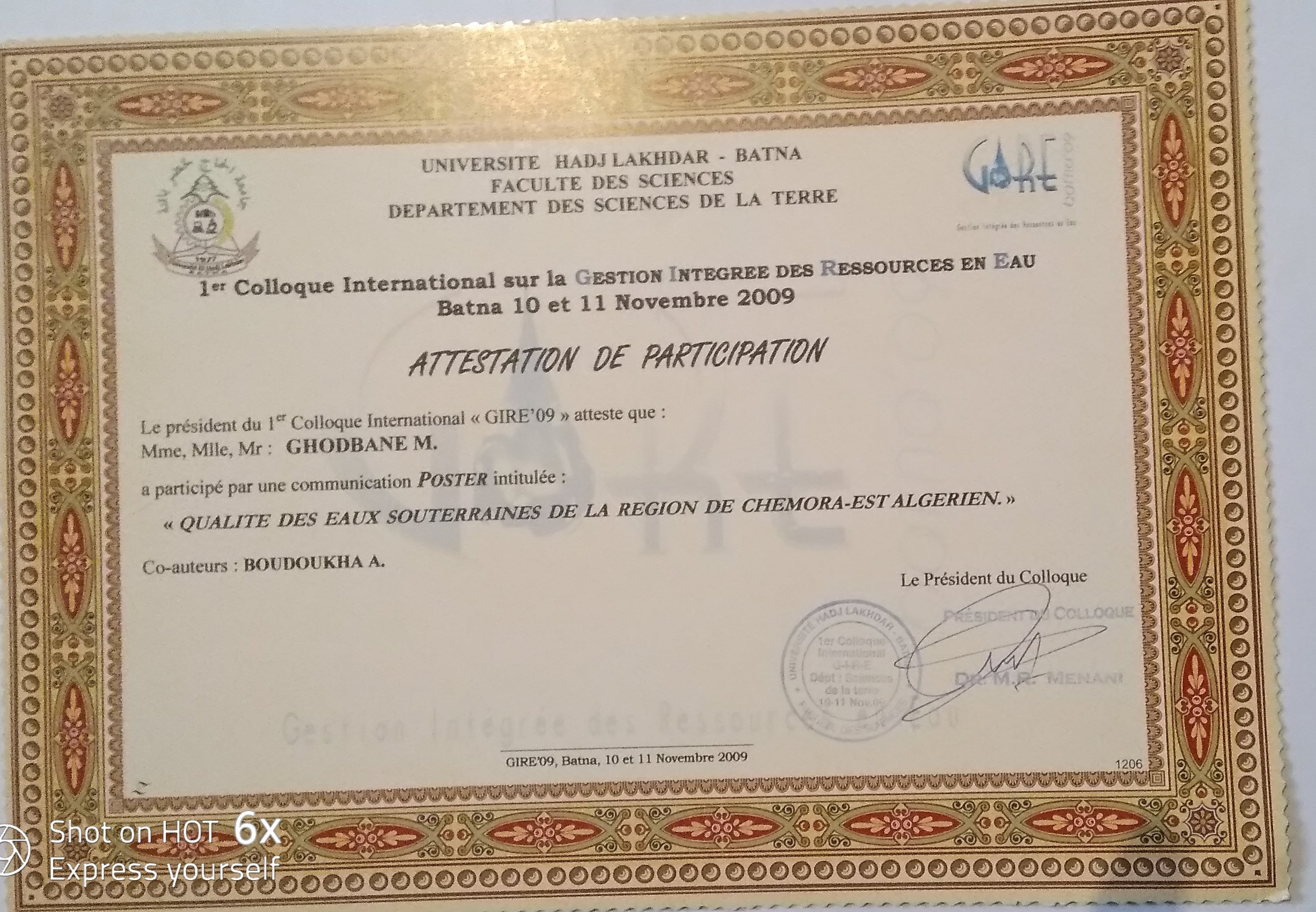 M. GHODBANE Messaoud, (2009), "Etude de la qualité des eaux de la région de Chemora - Est Algérien.", [international] Conference Internationale de la Gestion intégré des ressources en eau (GIRE Batna 2009) , Batna