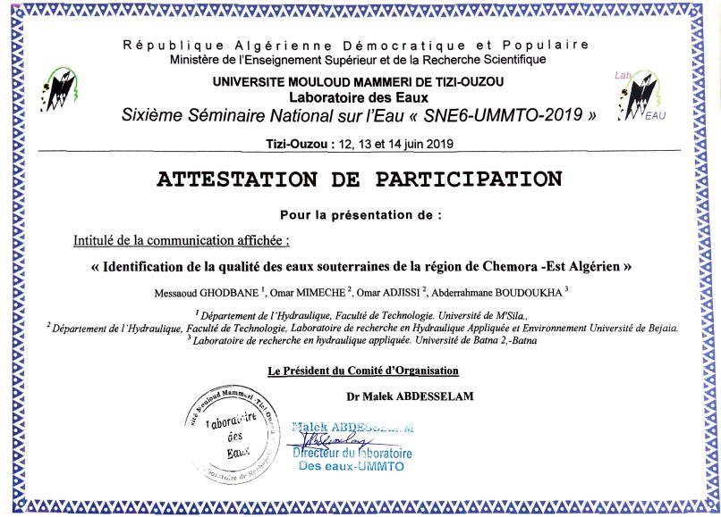 M. GHODBANE Messaoud, Omar Mimeche, Omar Adjissi, Abderrahmane Boudoukha, , (2019), "Identification de la Qualité des Eaux Souterraines de la Région de Chemora -Est Algérien-", [national] SNE6-2019-UMMTO "6ème SEMINAIRE SUR L’EAU" , Tizi-Ouzou les 12, 13 et 14 JUIN 2019