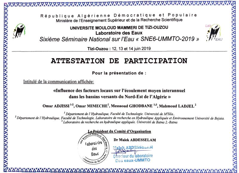 M. GHODBANE Messaoud, omar ADJISSI, omar MIMECHE, Mahmoud LADJEL, , (2019), "Influence des facteurs locaux sur l'écoulement ' moyen Interannuel dans les bassins versants du Nord-Est de l'Algérie", [national] "6ème Séminaire National SUR L’EAU" SNE6-2019-UMMTO , -Université Mouloud Mammeri Tizi- : 12, 13 et 14 Juin 2019