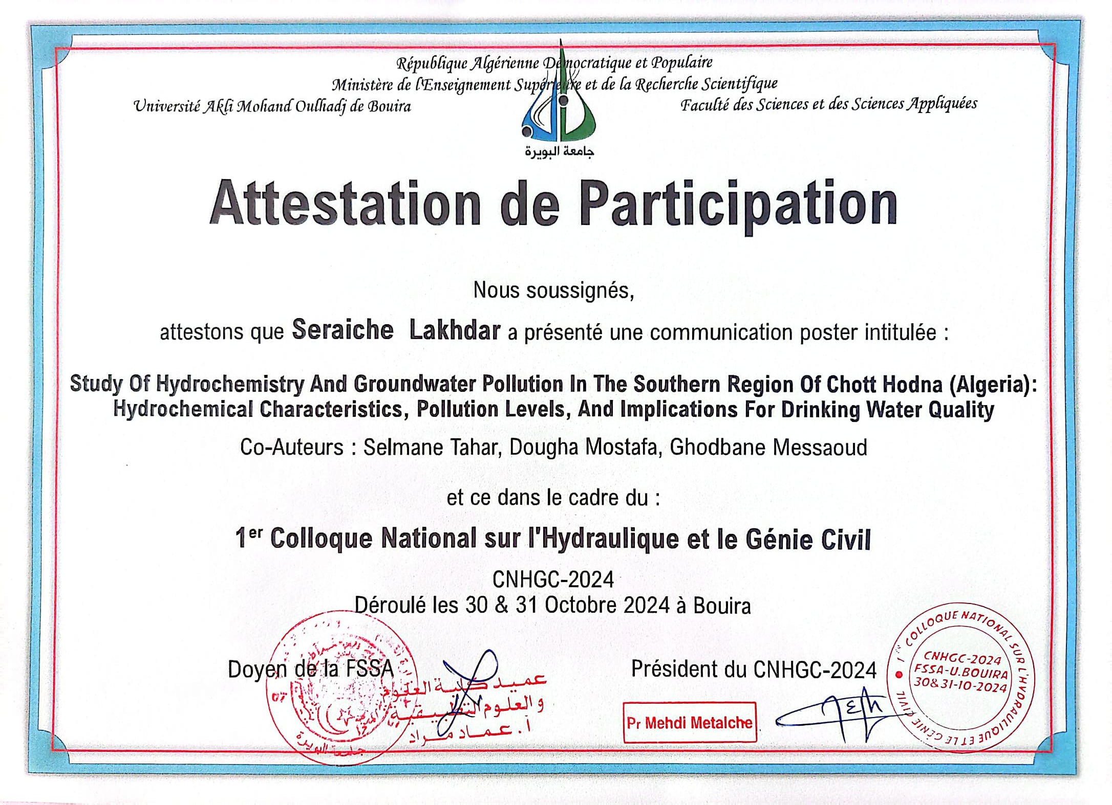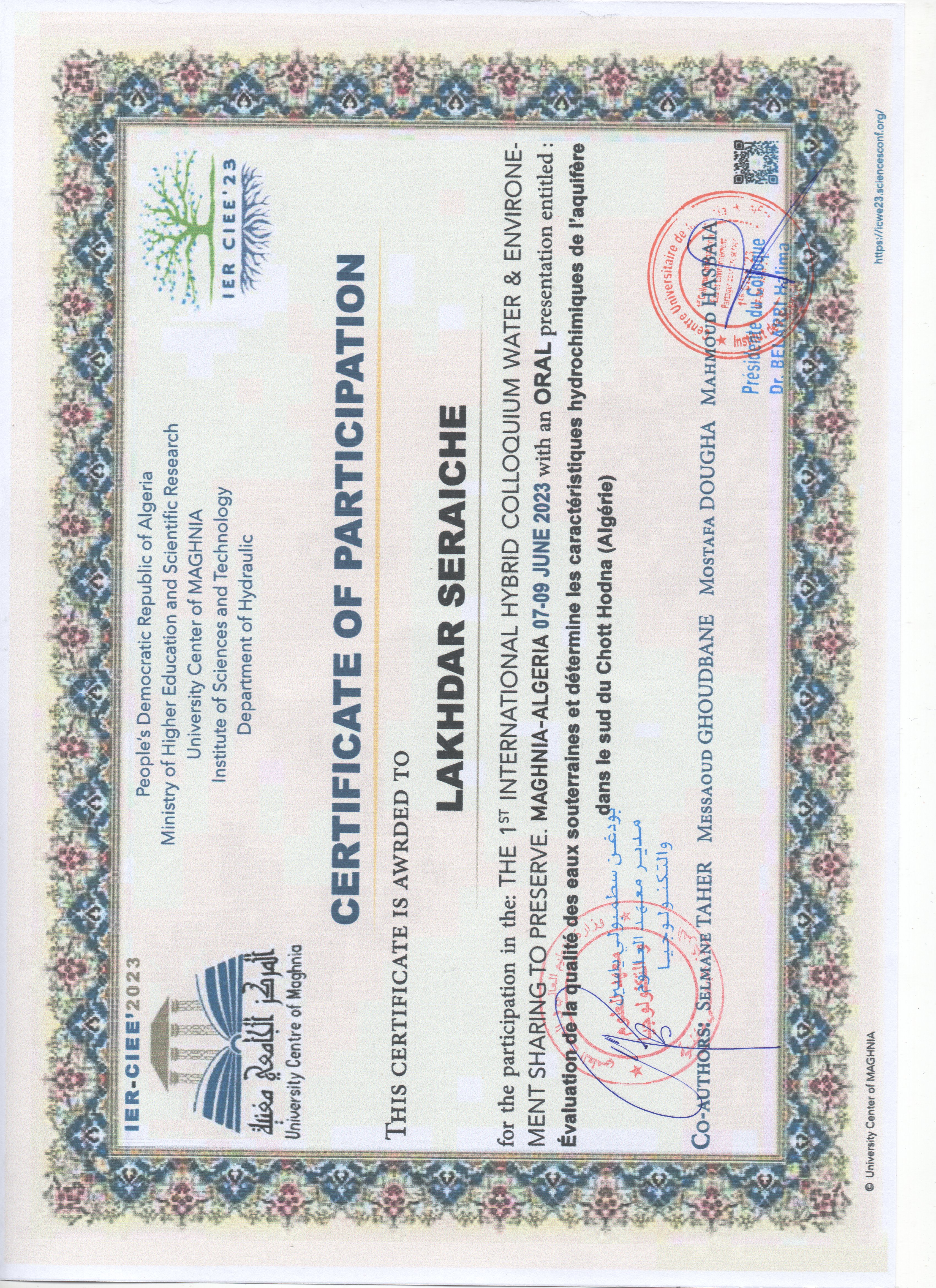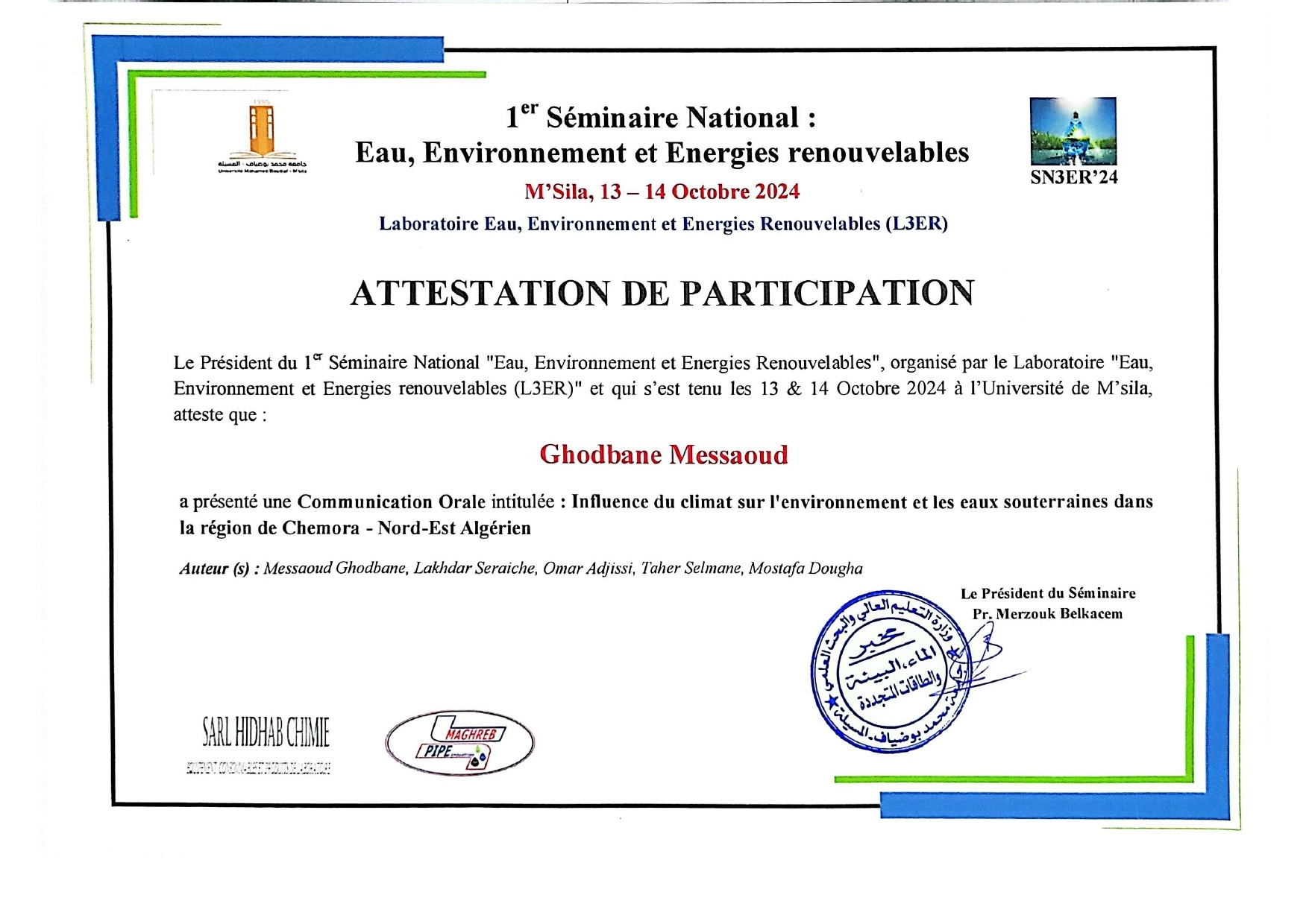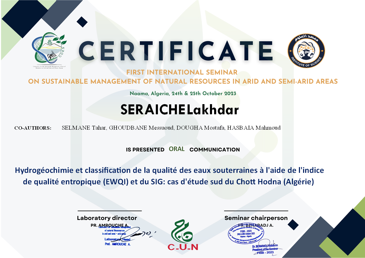 M. GHODBANE Messaoud, (2023-10-24), "Hydrogéochimie et classification des eaux souterraines à l'aides des indices de qualité et SIG: Cas d'étude sud de Chott El -Hodna-(Algérie)", [international] THE 1st INTERNATIONAL SEMINAR ON SUSTAINABLE MANAGEMENT OF NATURAL RESSOURCES IN ARID AND SEMI-ARID AREAS , Naama- Algeria