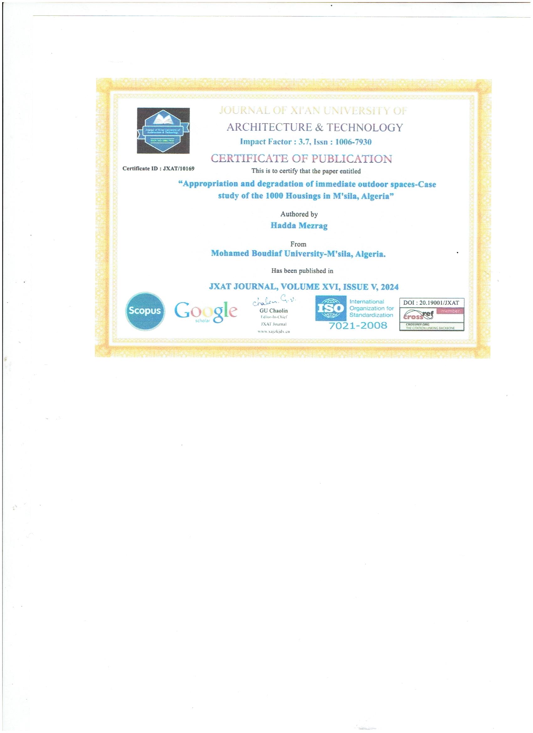 "LES ESPACES EXTERIEURS ENTRE APPROPRIATION ET DEGRADATION CAS DES LOGEMENTS SOCIAUX COLLECTIFS A M'SILA-ALGERIE",