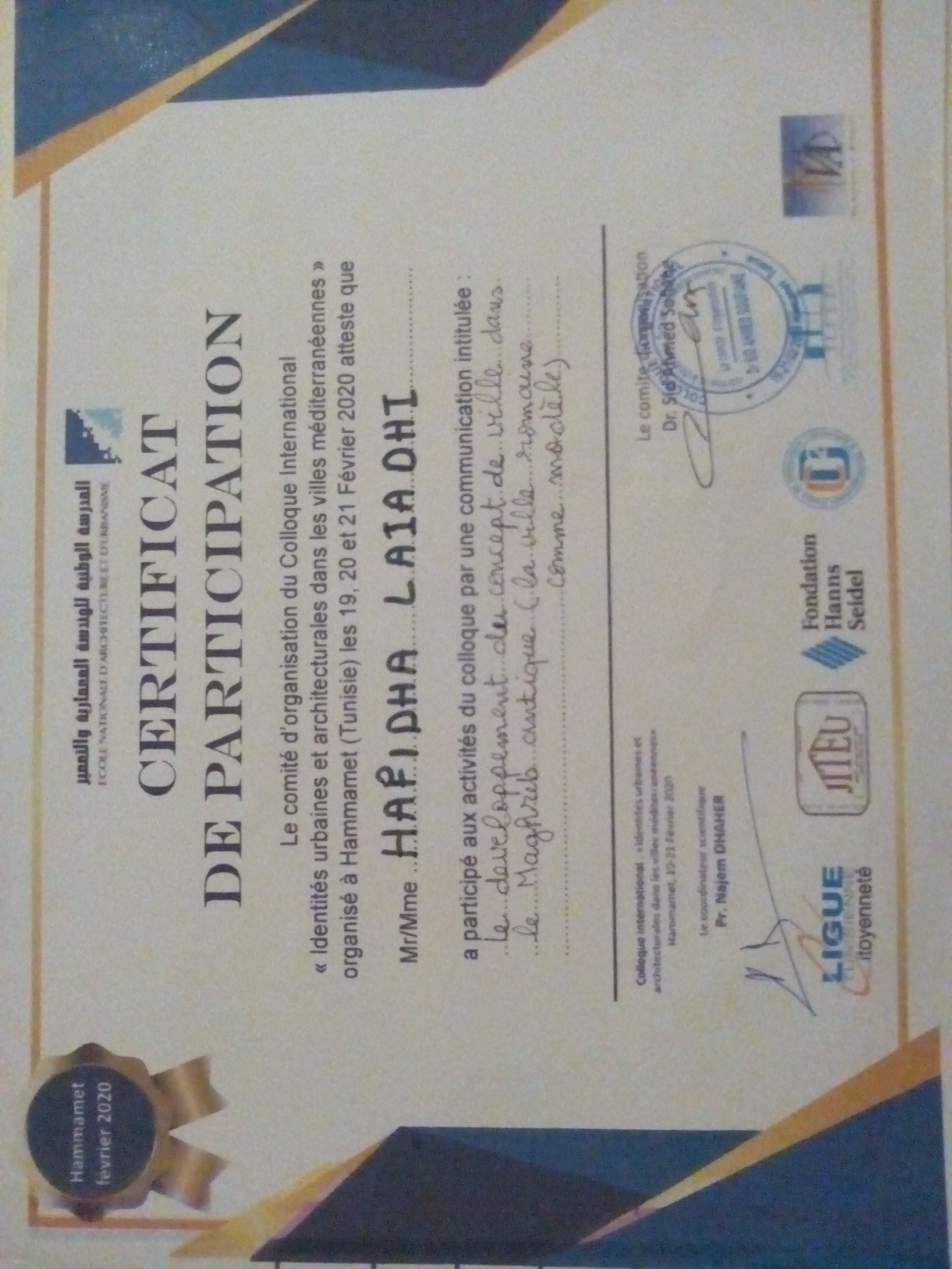 M. LAIADHI Hafidha, (2020), "le developpement du concept de ville dans le Maghreb antique (la ville romaine comme modèle)", [international] colloque international "identités urbaines et archetecturales dans les villes méditerranéennes" , Hammamet -Tunisie les 19,20 et 21 Février 2020