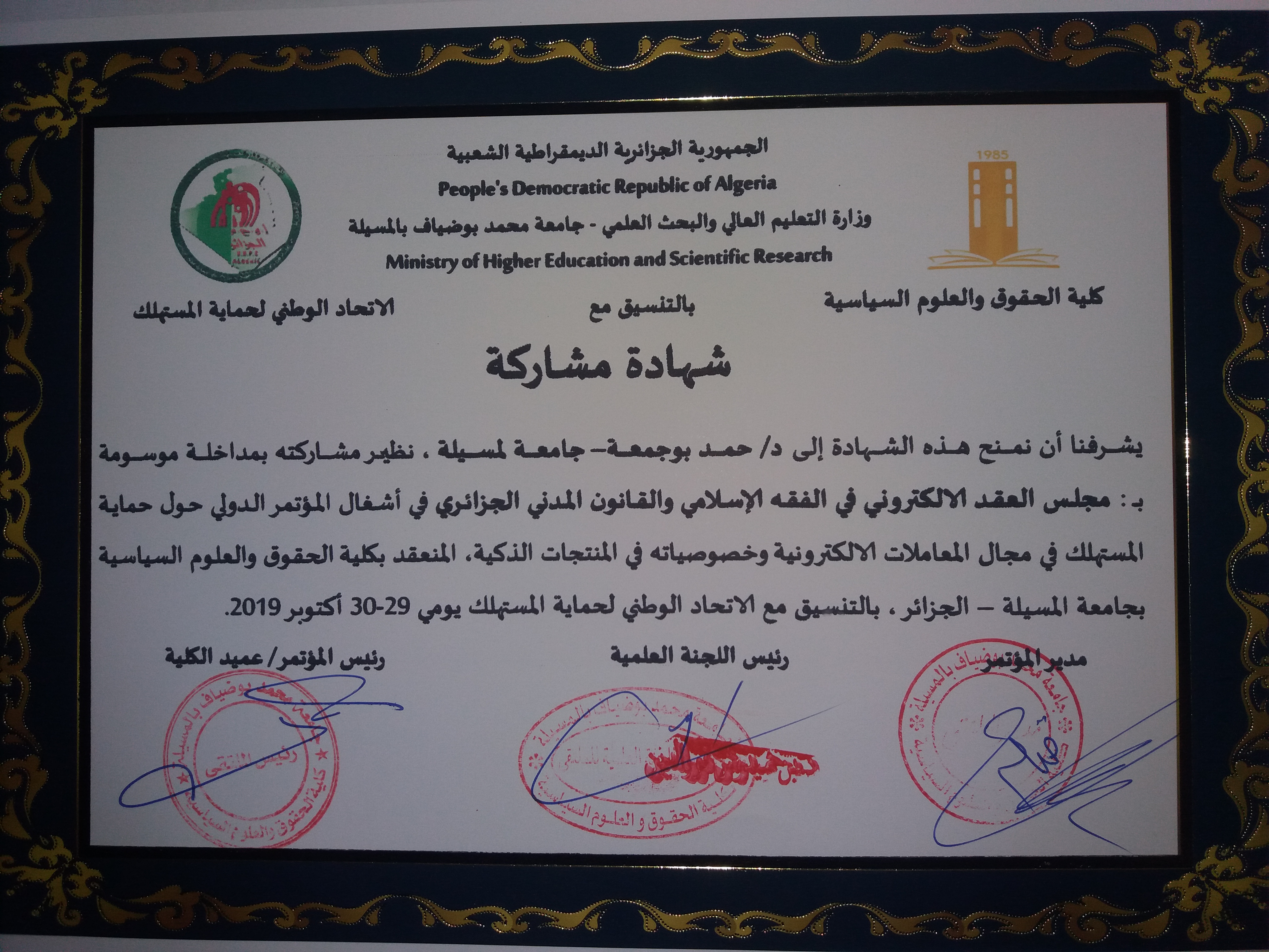 M. HAMMAD Boudjemaa, (2019), "مجلس العقد الالكتروني في الفقه الاسلامي والقانون المدني الجزائري", [international] حمايةالمستهلكفي مجال المعاملات الالكترونية وخصوصياته في المنتجات الذكية , كلية الحقوق والعلوم السياسية جامعة مسيلة