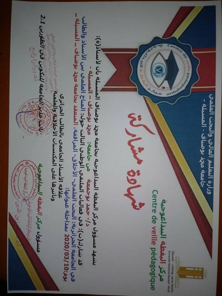 M. HAMMAD Boudjemaa, (2020), "المناخ العلمي بين الاستاذ والطالب في الجامعة الجزائرية", [national] علاقة الاستاذ الجامعي بالطالب الجزائري واثرها على المكتسبات الاخلاقية والعلمية , جامعة المسيلة