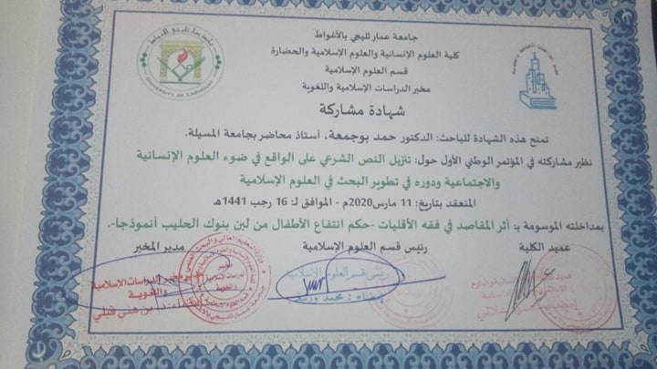 M. HAMMAD Boudjemaa, (2020), "تنزيل النص الشرعي على الواقع في ضضوء العلوم الانسانية والاجتماعيةودوره في تطوير البحث في العلوم الانسانية", [national] أثر المقاصد في فقه الاقليات - حكم انتفاع الاطفال من لبن بنوك الحليب , قسم العلوم الاسلامية جامعة الاغواط
