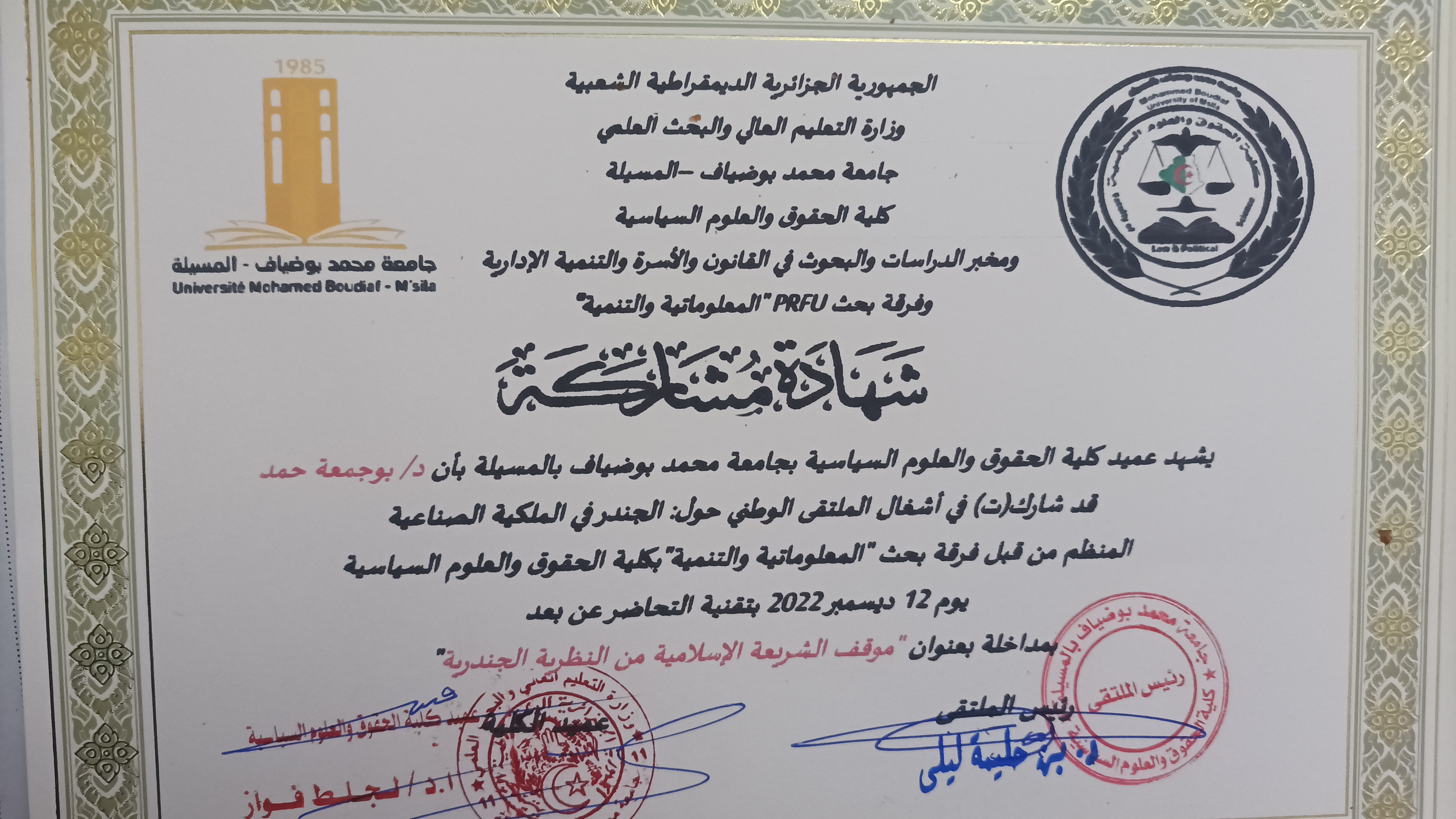 M. HAMMAD Boudjemaa, (2023-11-16), "القوامة بين الثابت والمتغير في ضوء مقاصد الشريعة الإسلامية", [national] بوجمعة حمد , جامعة الجلفة