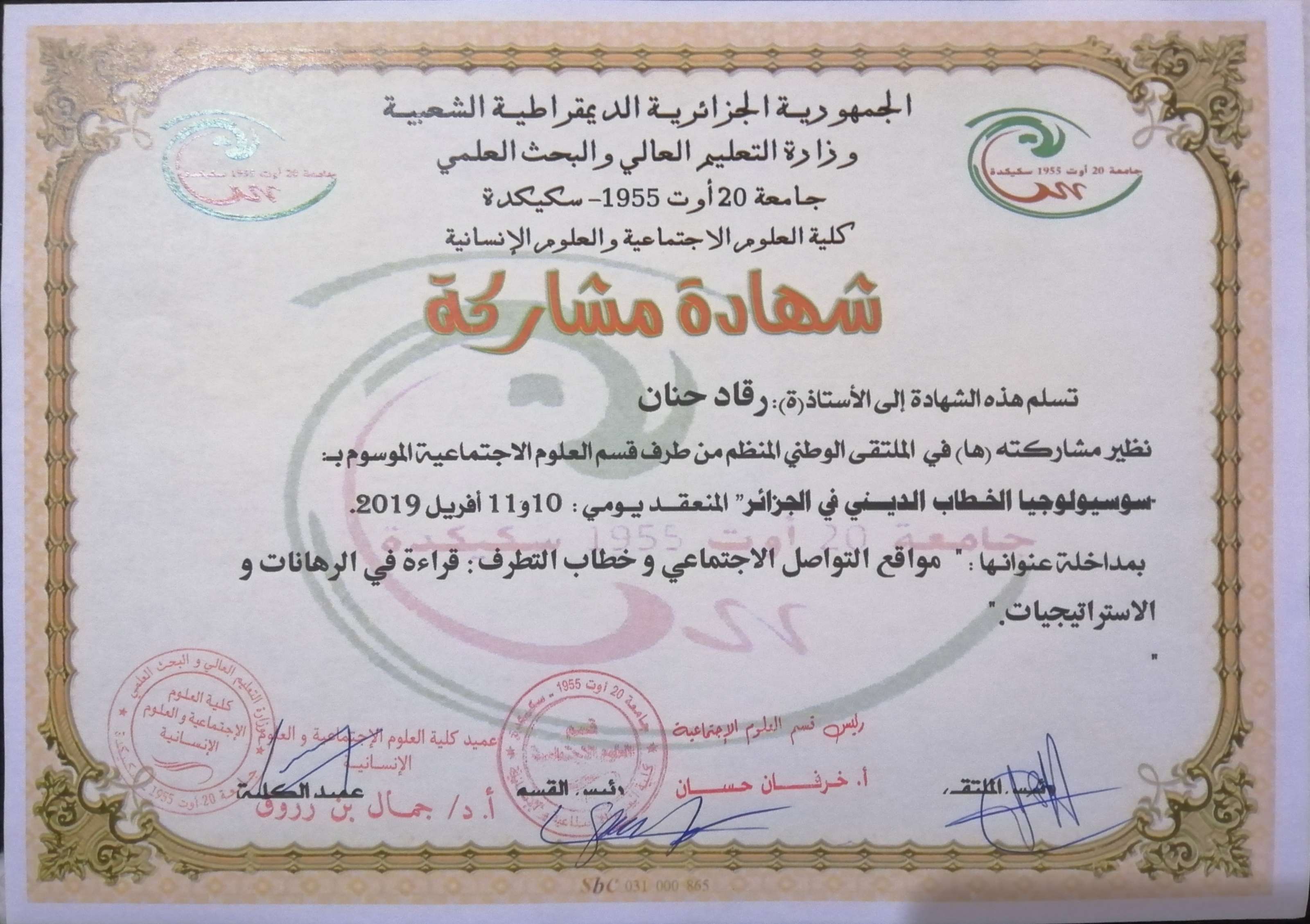 M. REGGAD Hanane, (2019), "مواقاقع التواصل الاجتماعي وخطاب التطرف:قراءة في الرهانات والاستراتيجيات", [national] سوسيولوجيا الخطاب الديني في الحزائر , جامعة 20 أوت 1955 سكيكدة