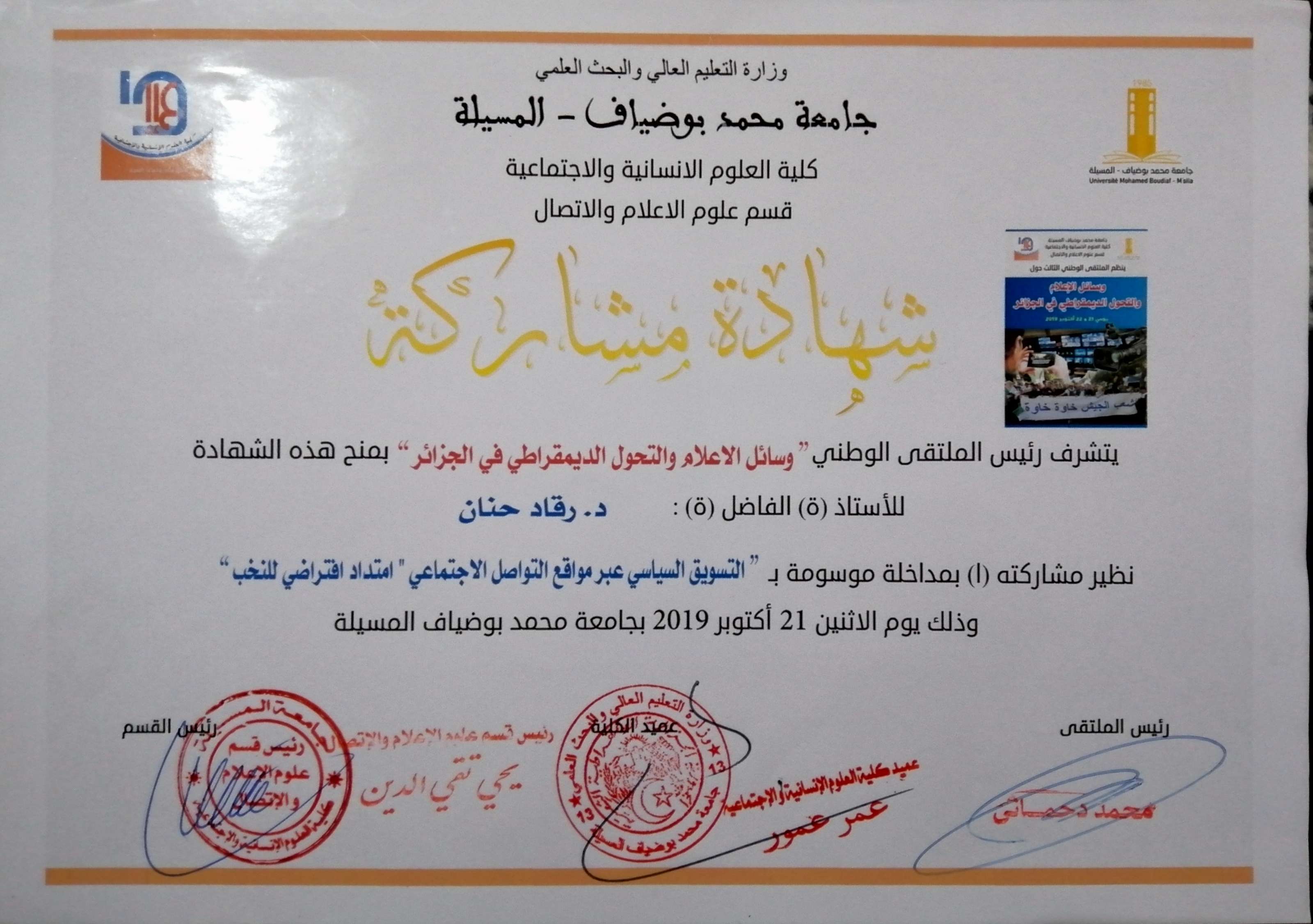 M. REGGAD Hanane, (2019), "التسويق السياسي عبر مواقع التواصل الاجتماعي امتداد إفتراضي للنخب", [national] وسائل الاإعلام والتحول الديموقراطي , جامعة محمد بوضياف مسيلة