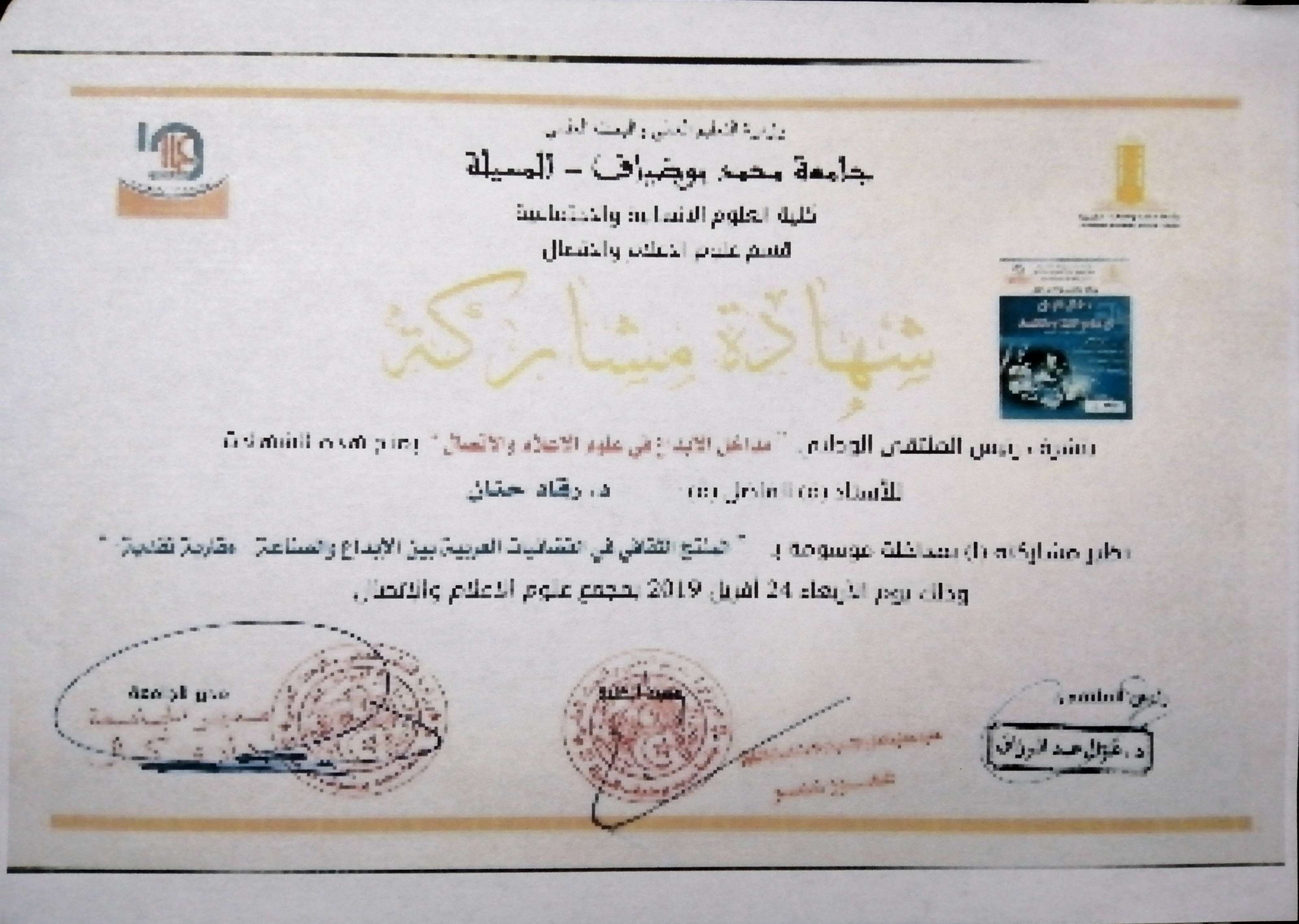 M. REGGAD Hanane, (2018), "المنتج الثقافي في الفضائيات العربية بين الابداع والصناعة – مقاربة نقدية-", [national] مداخل الإبداع في علوم الاعلام والاتصال .. نجو اتجاهات عصرية متميزة.. , جامعة مسيلة