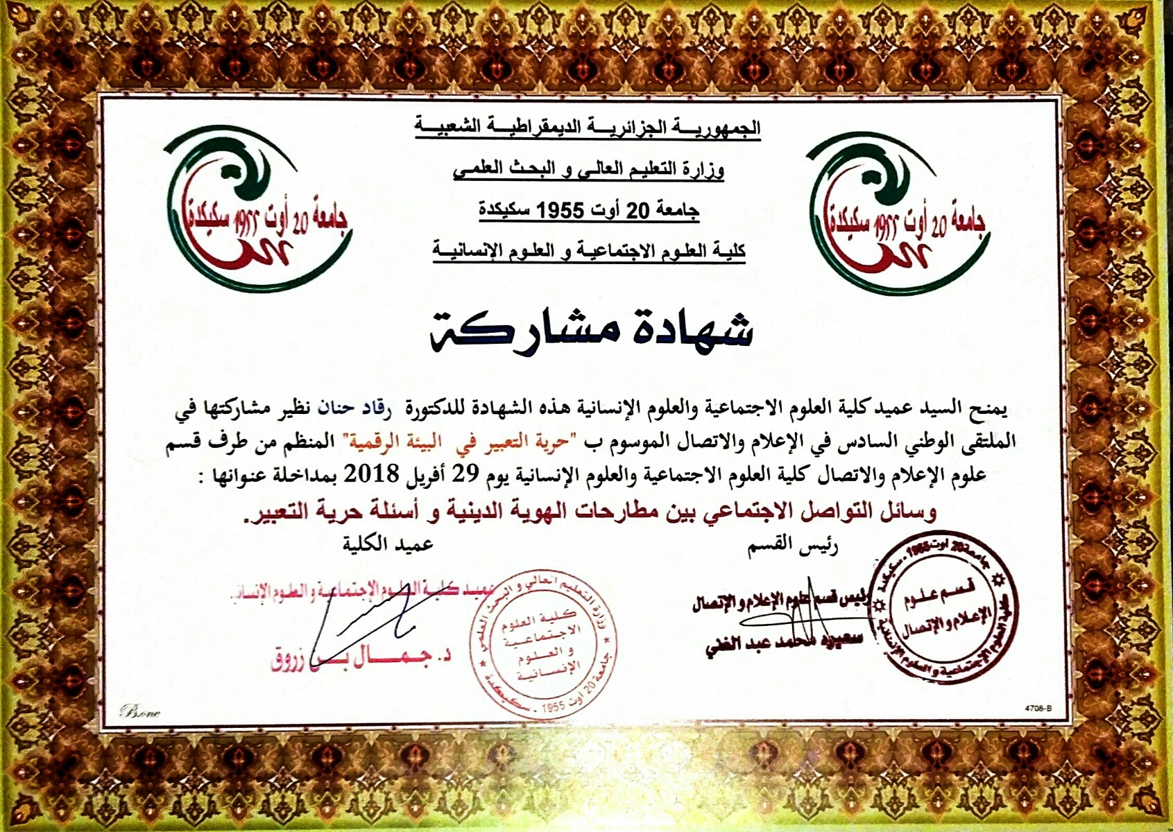 M. REGGAD Hanane, (2018), "وسائل التواصل الاجتماعي بين مطارحات الهوية الدينية وأسئلة حرية التعبير", [national] حرية التعبير في البيئة الرقمية , جامعة 20 أوت 1955 سكيكدة