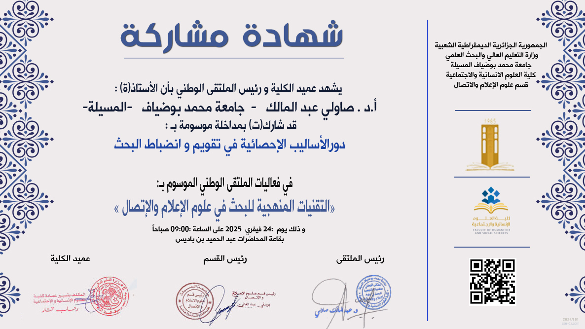 M. SAOULI صاولي Abdelmalik عبد المالك, (2025-02-24), "التقنيات المنهجية للبحث في علوم الاعلام والاتصال", [national] ضبط الأدوات والمعالجات الإحصائية للبيانات قراءة في المفاهيم والاليات والصعوبات عنوان المقال , جامعة محمد بوضياف - المسيلة