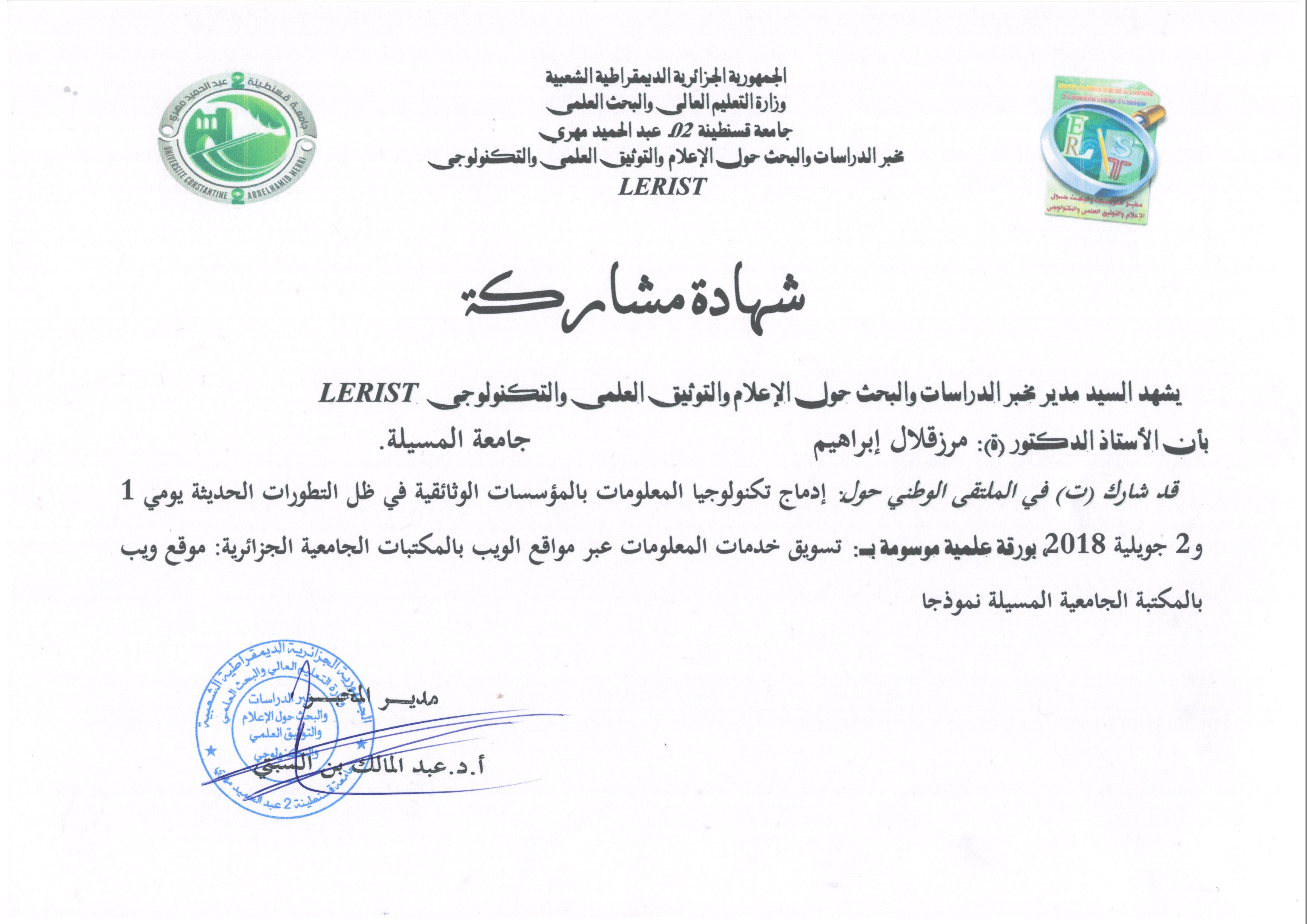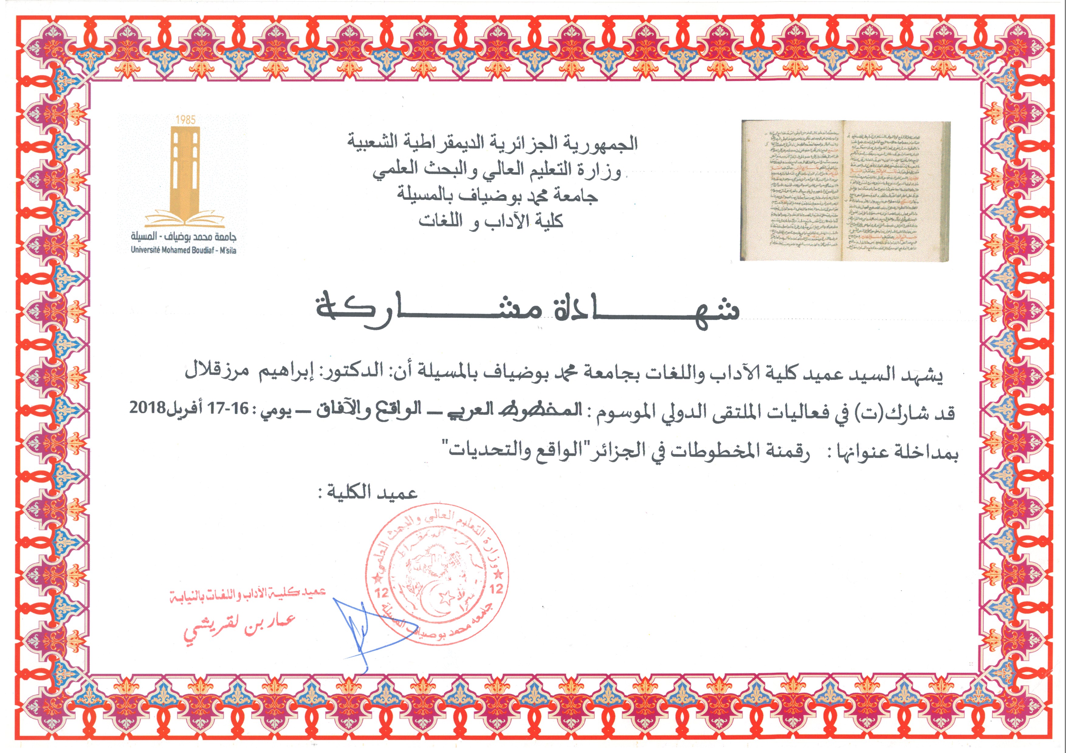 M. MORZOUGLAL Brahim, (2018), "رقمنة المخطوطات في الجزائر -الواقع والتحديات", [international] المخطوط العربي الواقع والآفاق , جامعة محمد بوضياف المسيلة