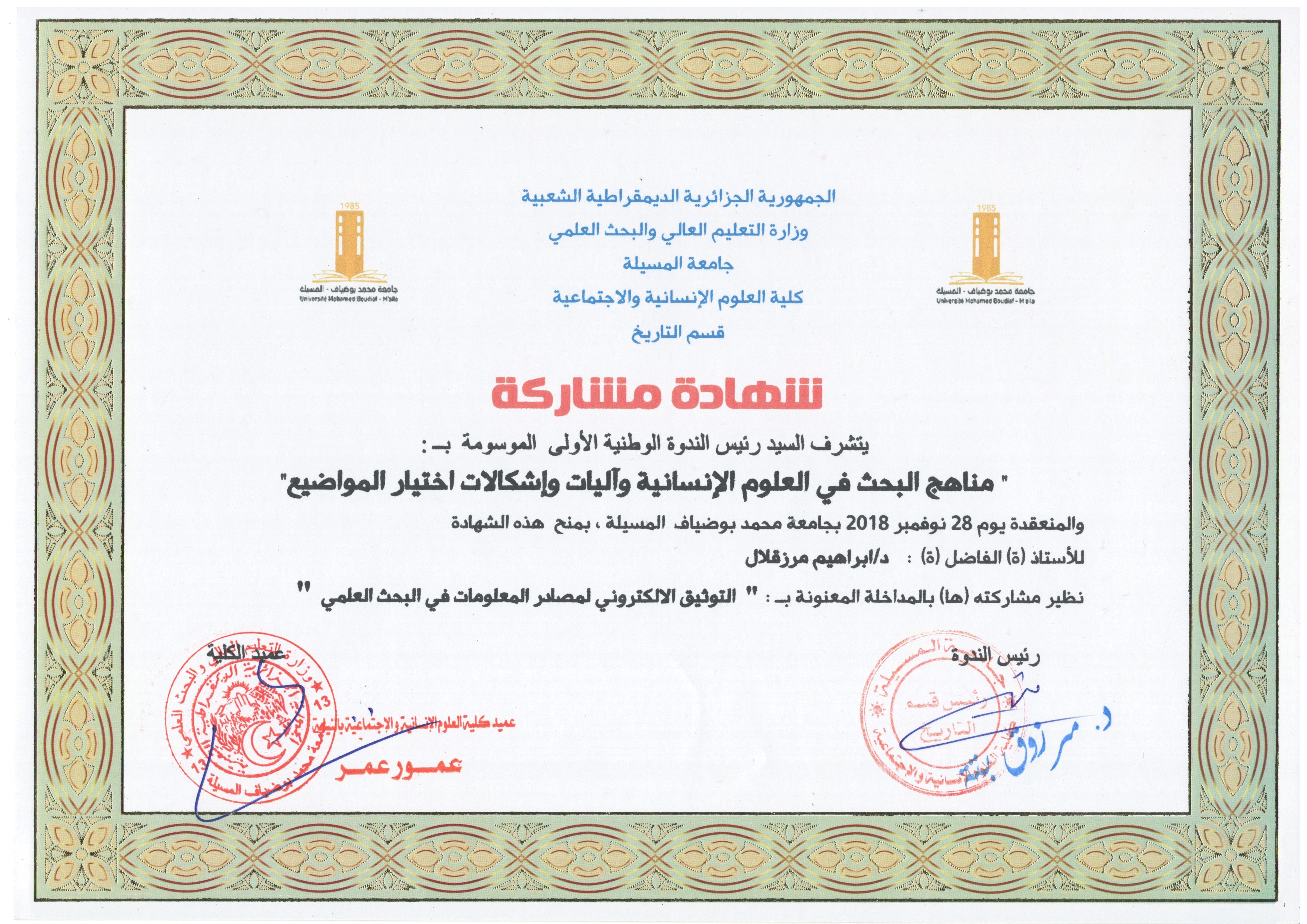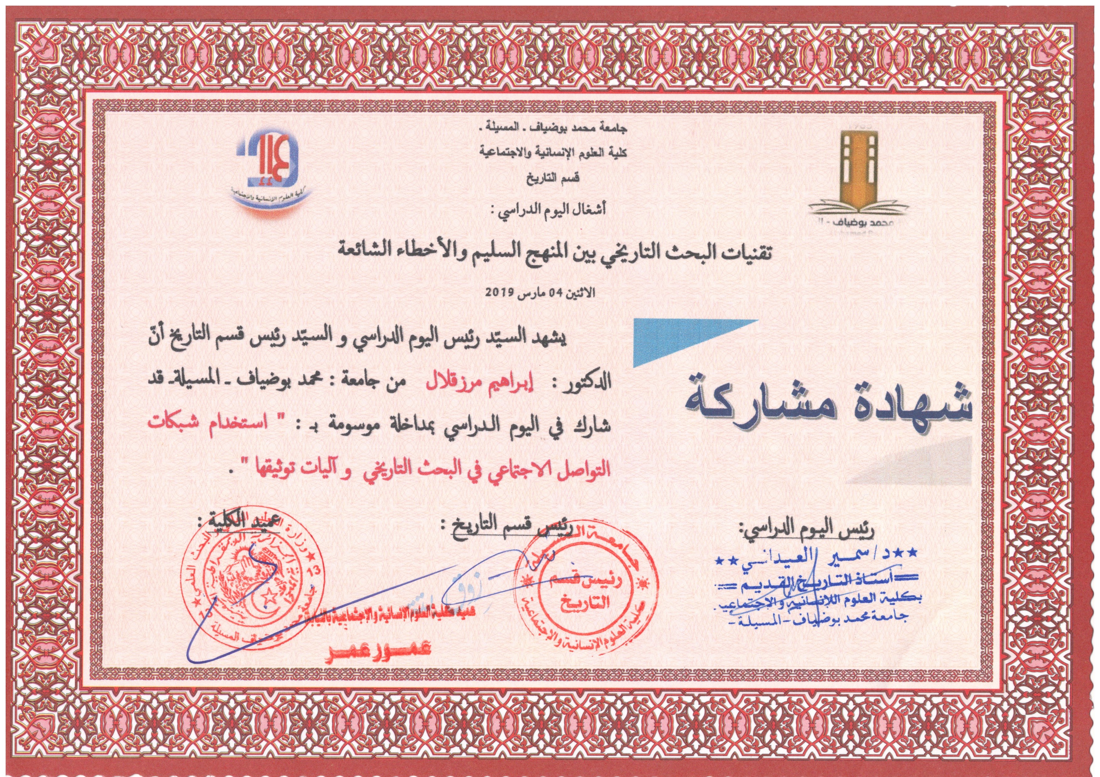M. MORZOUGLAL Brahim, (2019), "استخدام شبكات التواصل الاجتماعي في البحث التاريخي واليات توثيقها", [national] تقنيات البحث التارخي بين المنهج السليم والاخطاء الشائعة , جامعة محمد بوضياف المسيلة