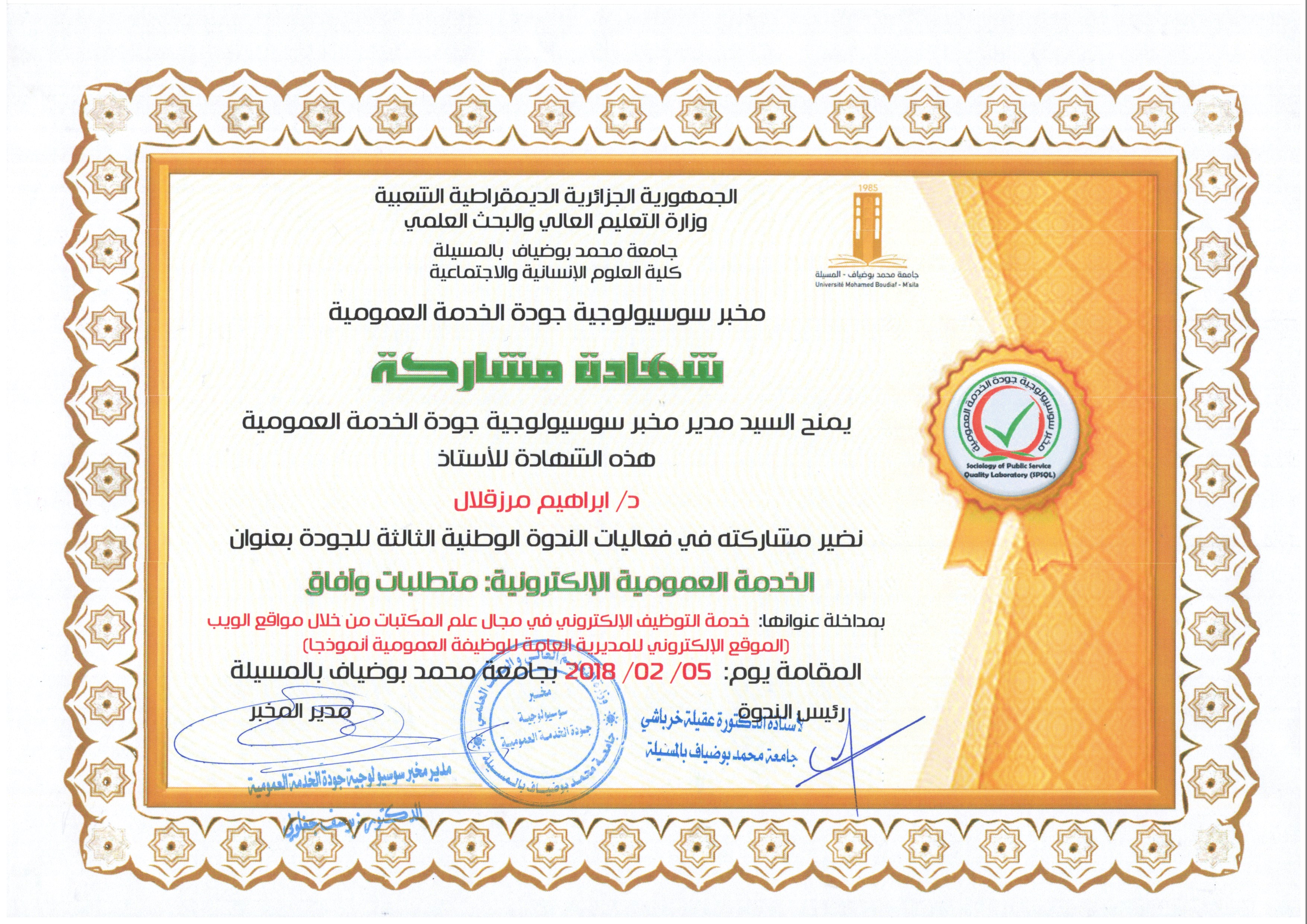 M. MORZOUGLAL Brahim, (2018), "خدمة التوظيف الالكتروني في مجال علم المكتبات", [national] الخدمة العمومية الالكترونية:متطلبات وافاق , جامعة محمد بوضياف المسيلة