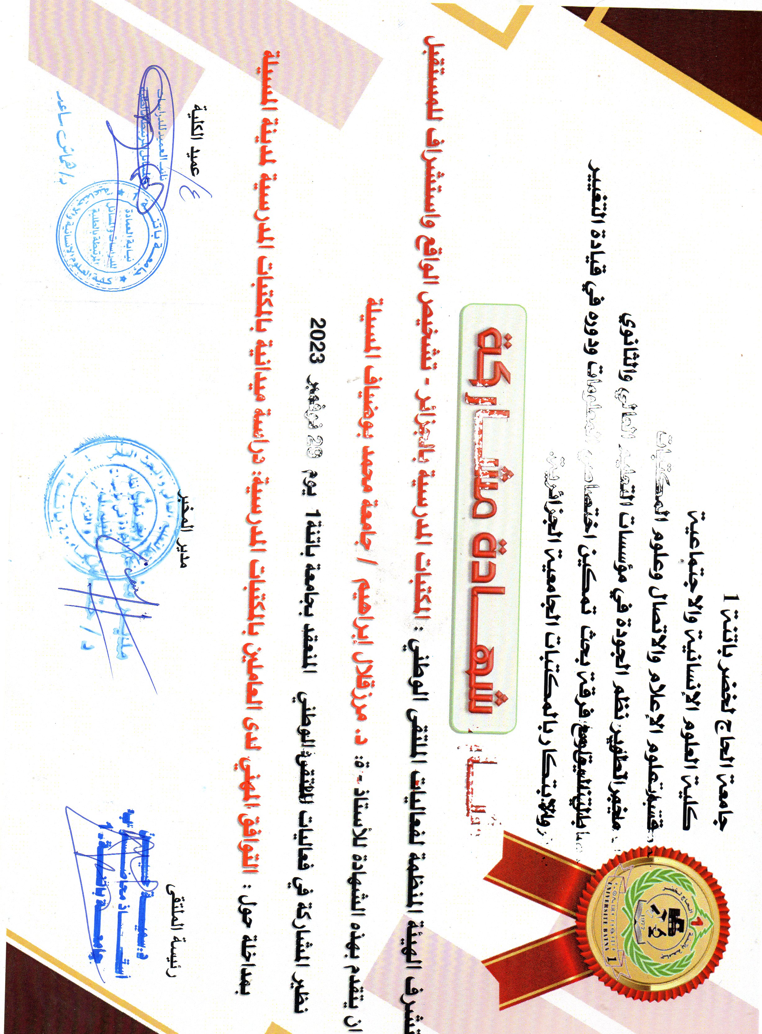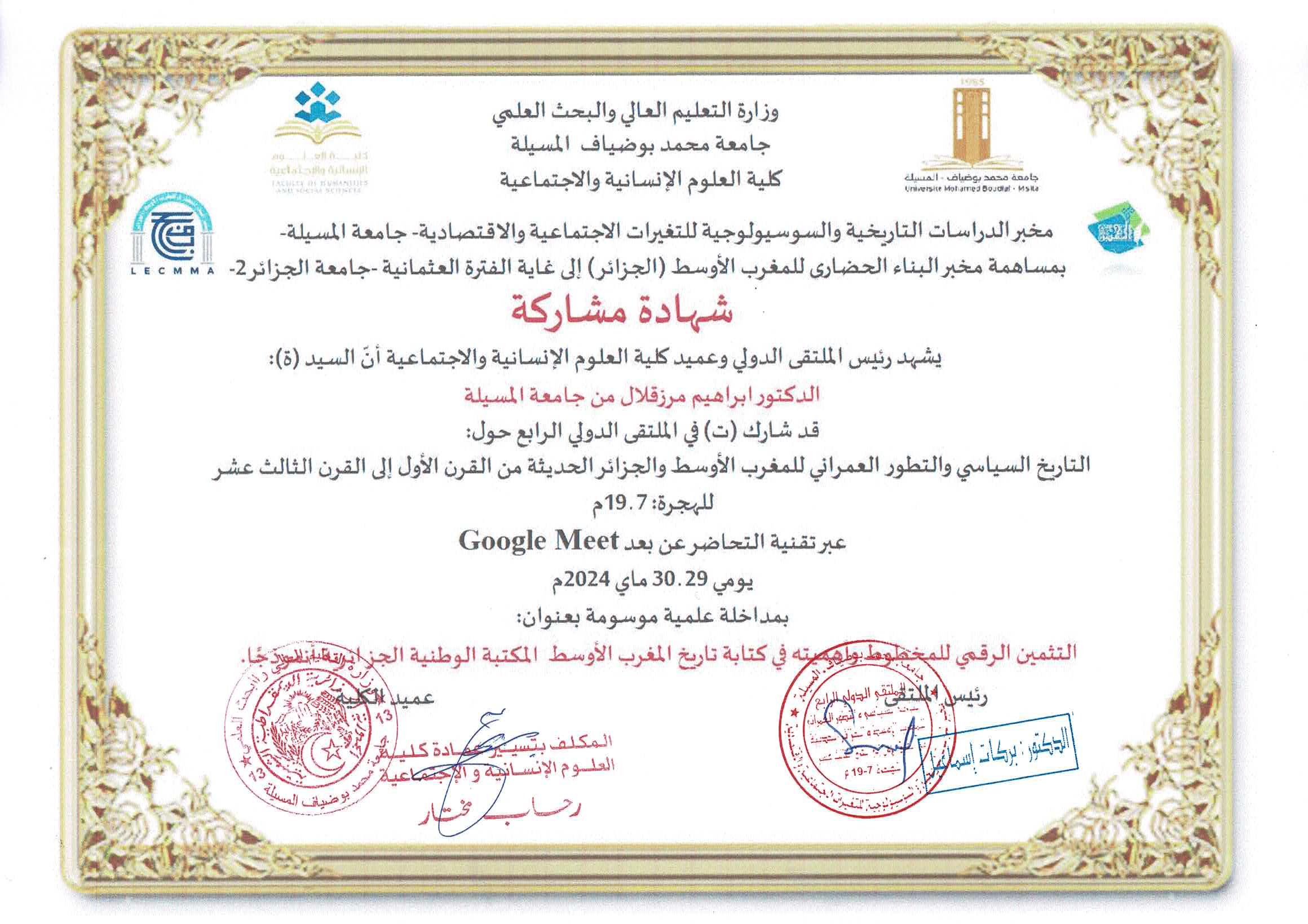 M. MORZOUGLAL Brahim, (2024-05-30), "التثمين الرقمي للمخطوط واهميته في كتابة تاريخ المغرب الاوسط : مخطوطات المكتبة الوطنية الجزائرية انموذجا", [international] التاريخ السياسي والتطور العمراني للمغرب الاوسط والجزائر الحديثة , جامعة المسيلة