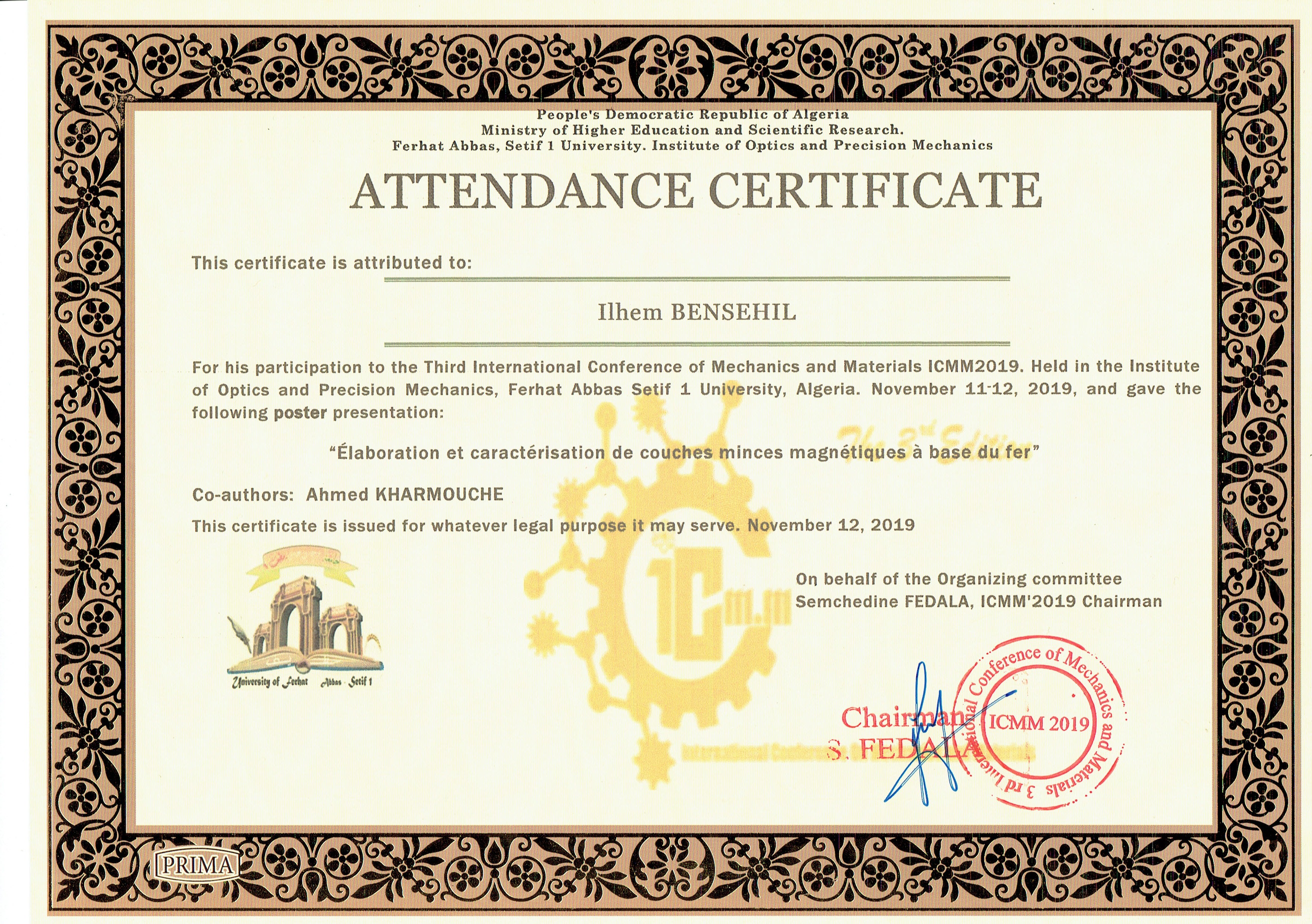 M. BENSEHIL Ilhem, (2019), "ELABORATION ET CARACTERISATION DE COUCHES MINCES MAGNETIQUES A BASE DU FER", [international] International conference on Mechanics and Materials (ICMM19) , Sétif