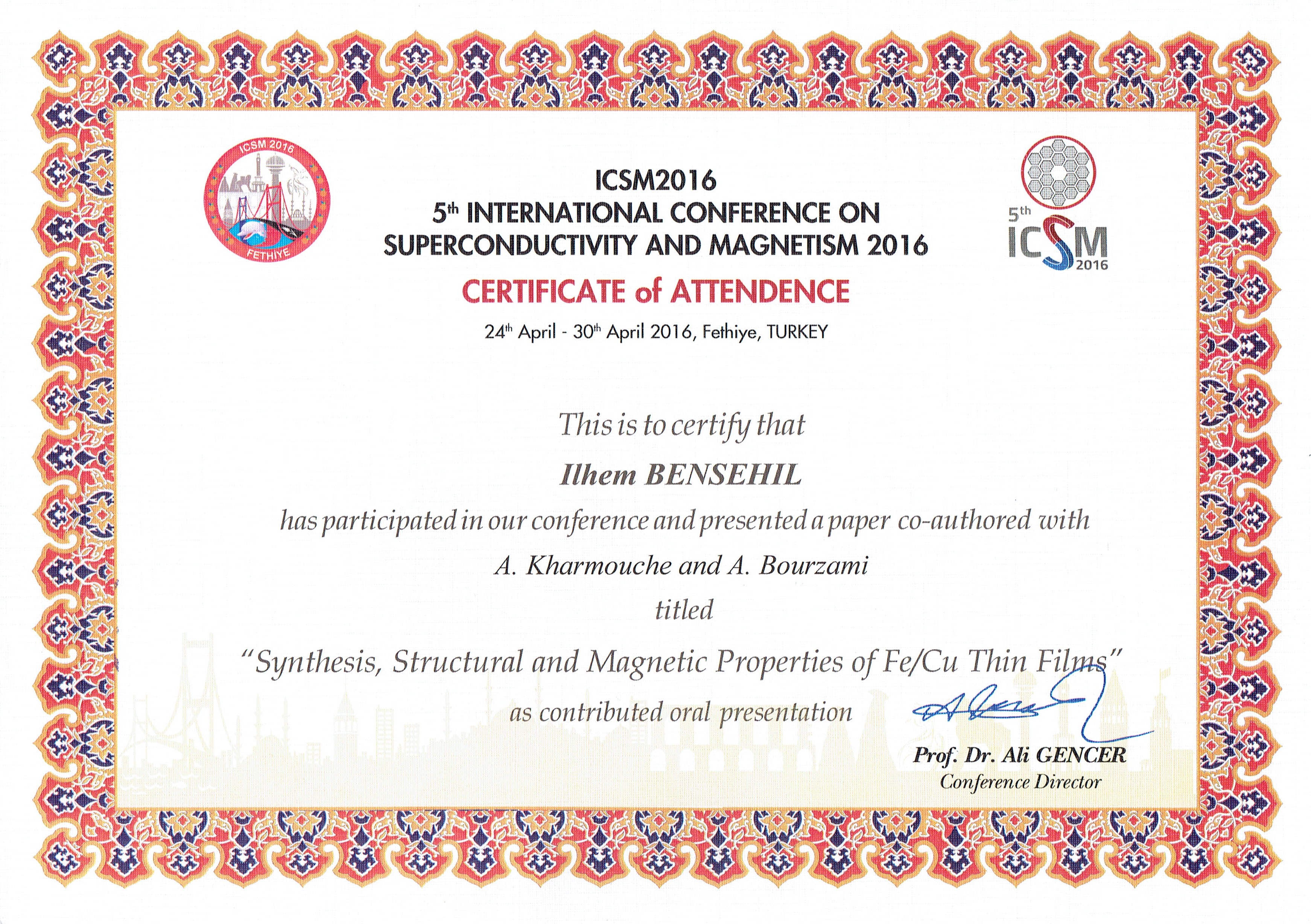 M. BENSEHIL Ilhem, (2016), "Synthesis, Structural and Magnetic Properties of Fe/Cu thin films", [international] International Conference on Superconductivity and Magnetism(ICSM2016) , Turquie