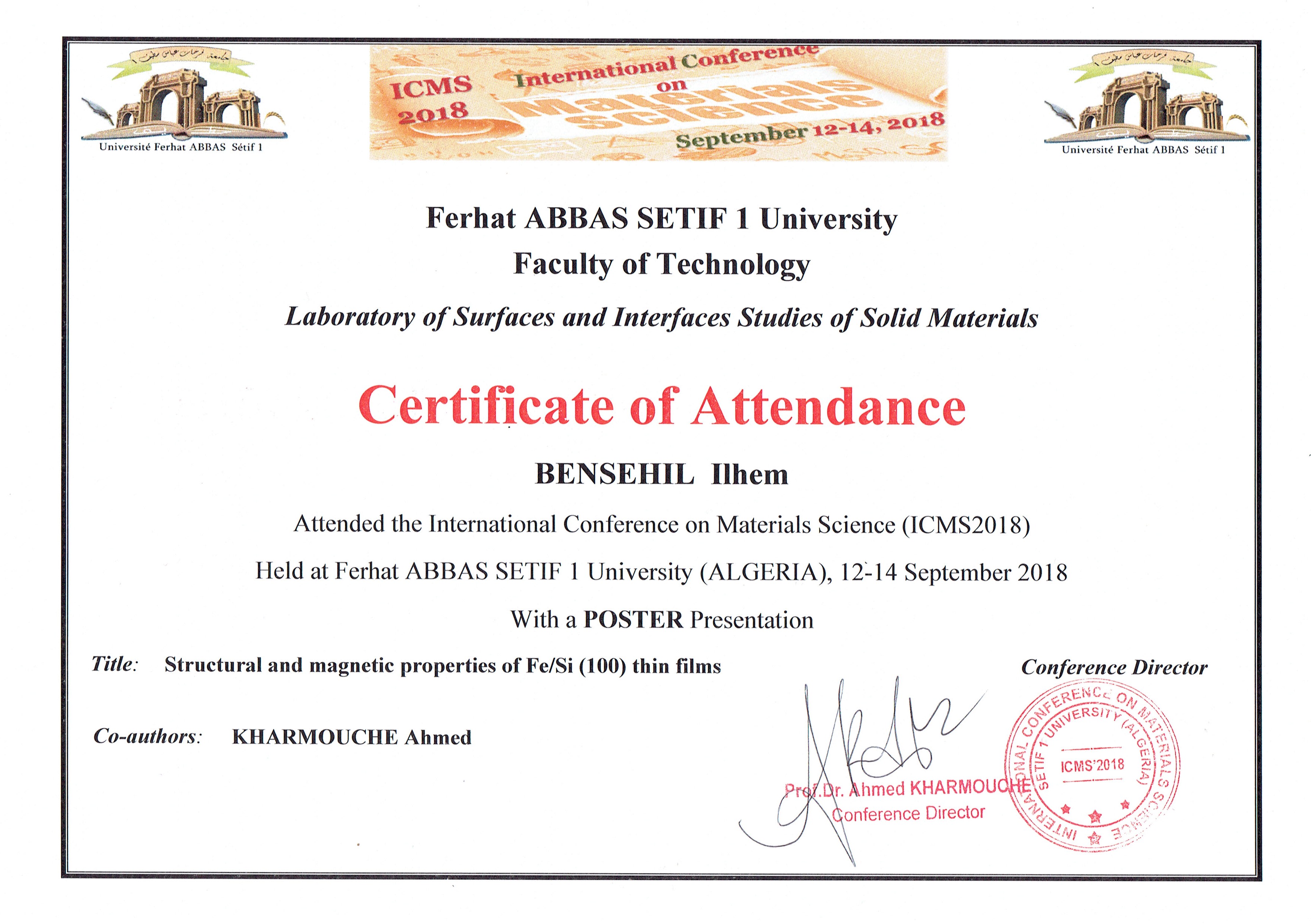 M. BENSEHIL Ilhem, Ahmed KHARMOUCHE, , (2018), "Structural and magnetic properties of Fe/Si(100) thin films", [international] International Conference on Materials Science (ICMS_2018) , Sétif