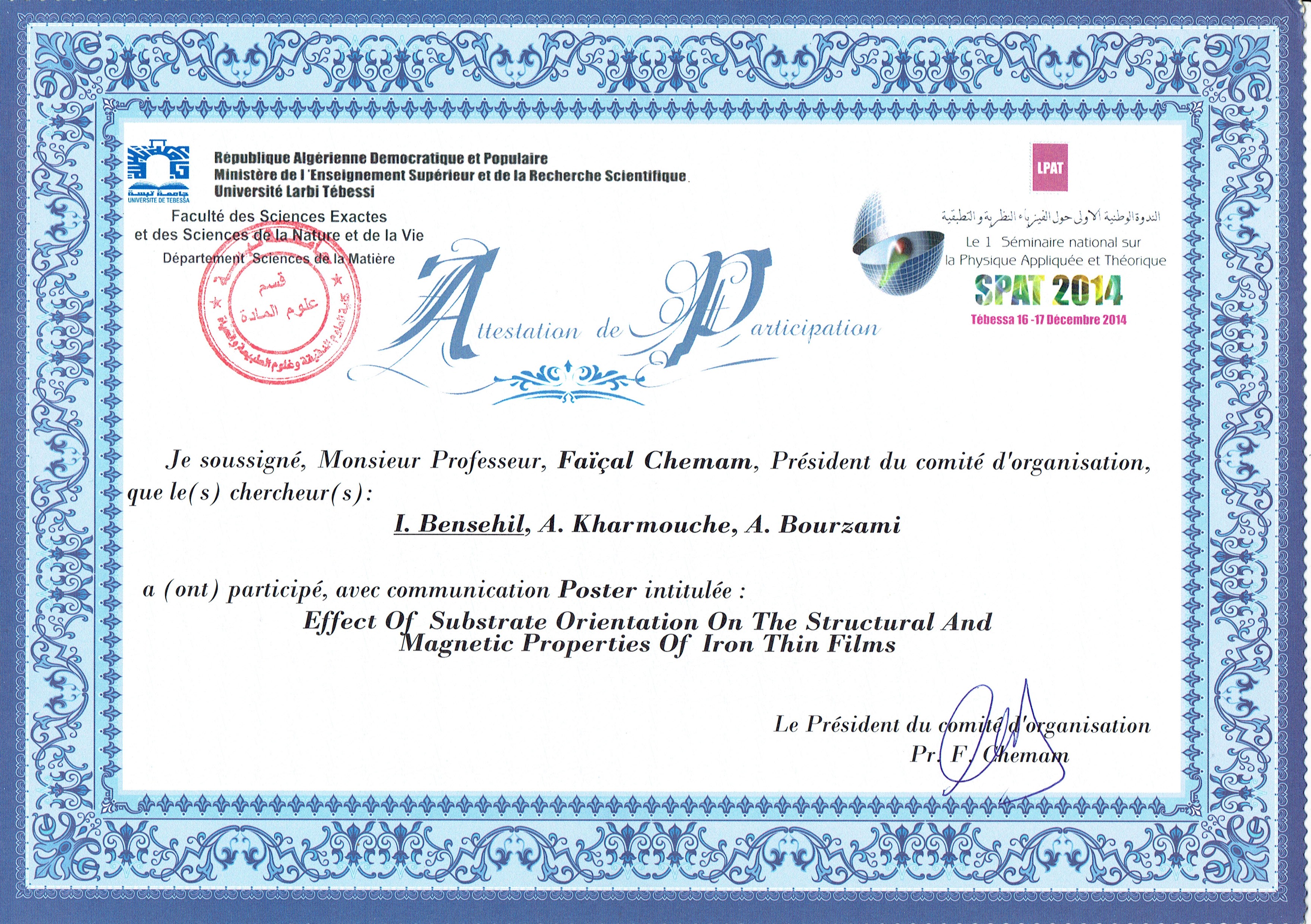M. BENSEHIL Ilhem, (2014), "Effet du substrat sur les propriétés structurales et magnétiques de couches minces de Fer", [national] Le 1er Séminaire national sur la Physique Appliquée et Théorique (SPAT’2014) , Tébessa
