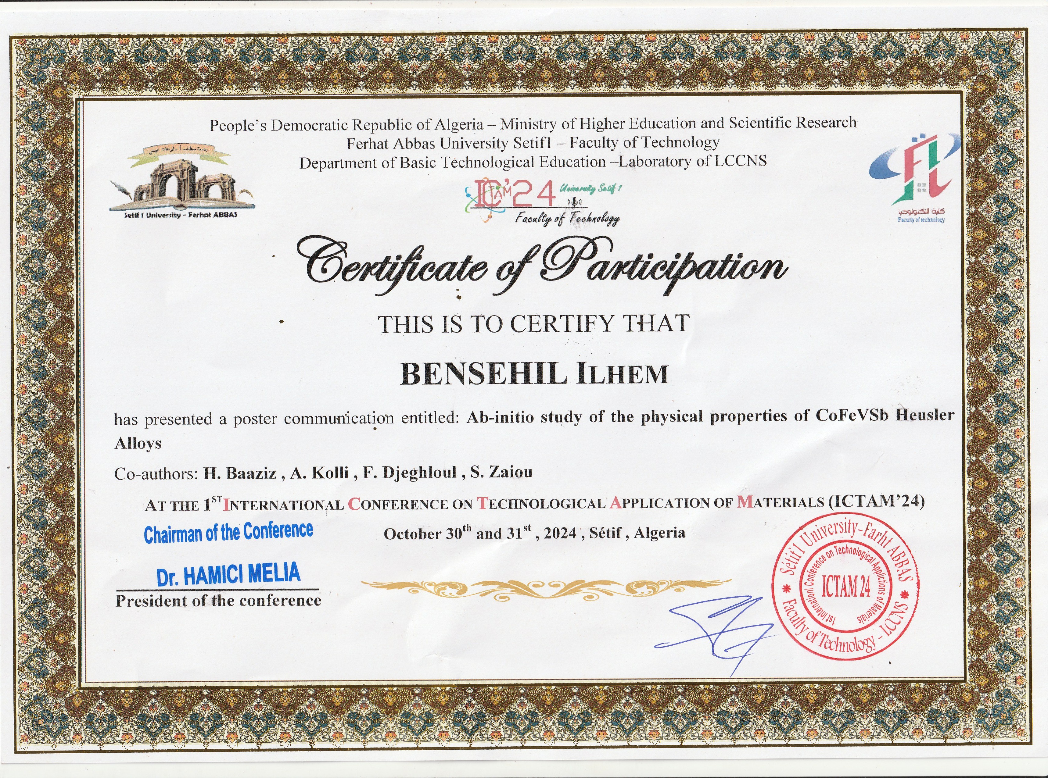 M. BENSEHIL Ilhem, (2024-10-30), "Ab-initio study of the physical properties of CoFeVSb Heusler Alloys", [international] ICTAM'24 , Setif