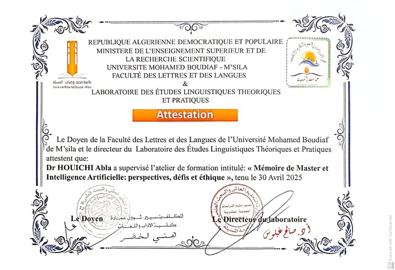 M. HOUICHI Abla, (2025-04-30), "Mémoire de Master et Intelligence Artificielle: perspectives, défis et éthique", [national] Mémoire de Master et Intelligence Artificielle: perspectives, défis et éthique , Université Mohamed Boudhiaf de M'sila