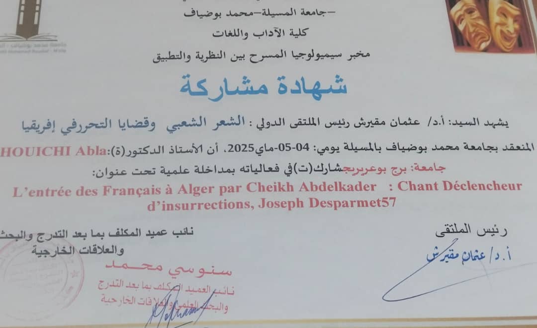 M. HOUICHI Abla, (2025-05-04), "« L’entrée des Français à Alger par Cheikh Abdelkader » : Chant déclencheur d’insurrections, Joseph Desparmet", [international] الشعر الشعبي و قضايا التحرر في افريقيا , Université Mohamed Boudhiaf de M'sila