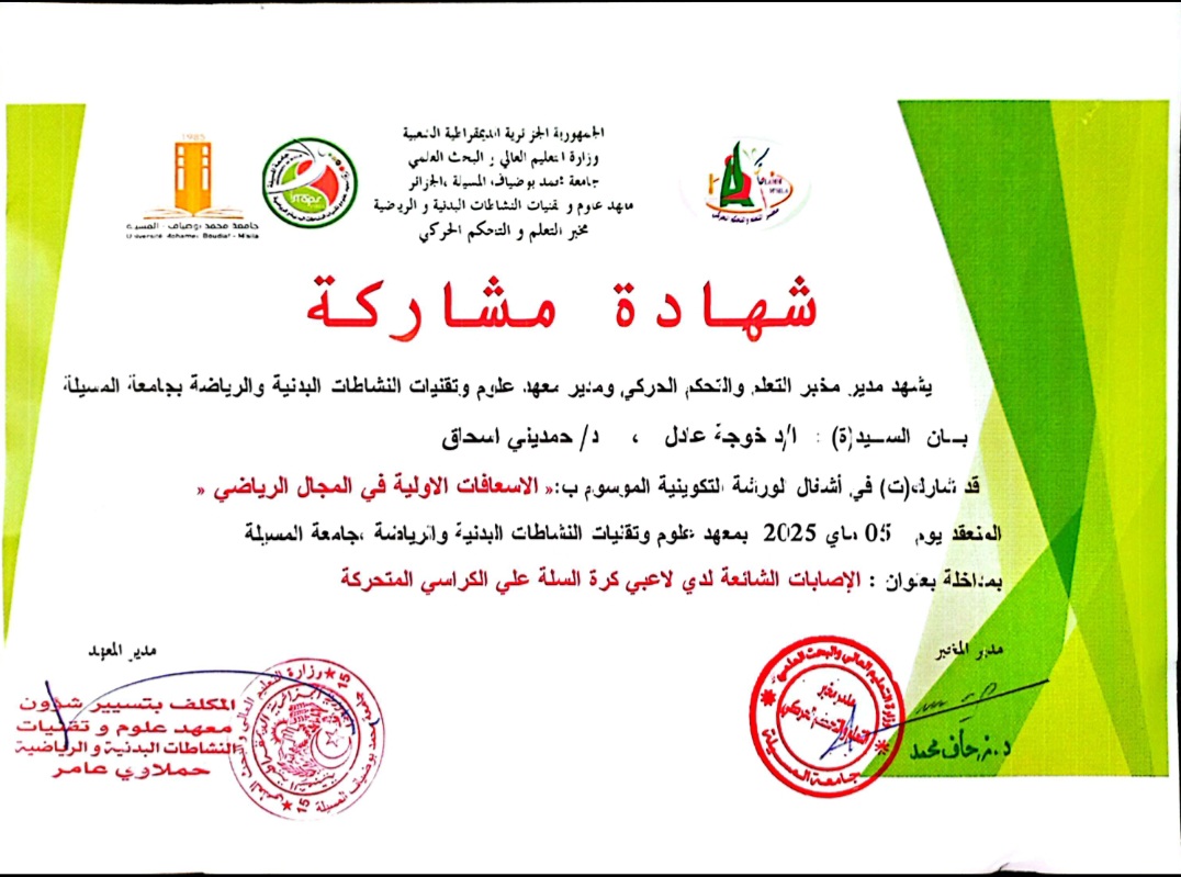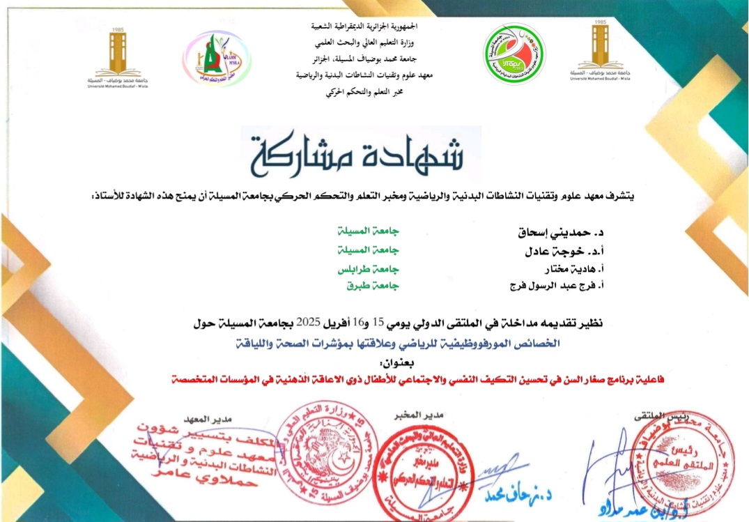 M. ADEL Khodja, (2025-04-15), "فاعلية برنامج صغار السن في تحسين التكيف النفسي والاجتماعي للاطفال ذوي الإعاقة الذهنية في المؤسسات المتخصصة", [international] الخصائص المورفووظيفية للرياضيوعلاقتها بمؤشرات الصحة واللياقة , معهد علوم وتقنيات النشاطات البدنية والرياضية - جامعة المسيلة