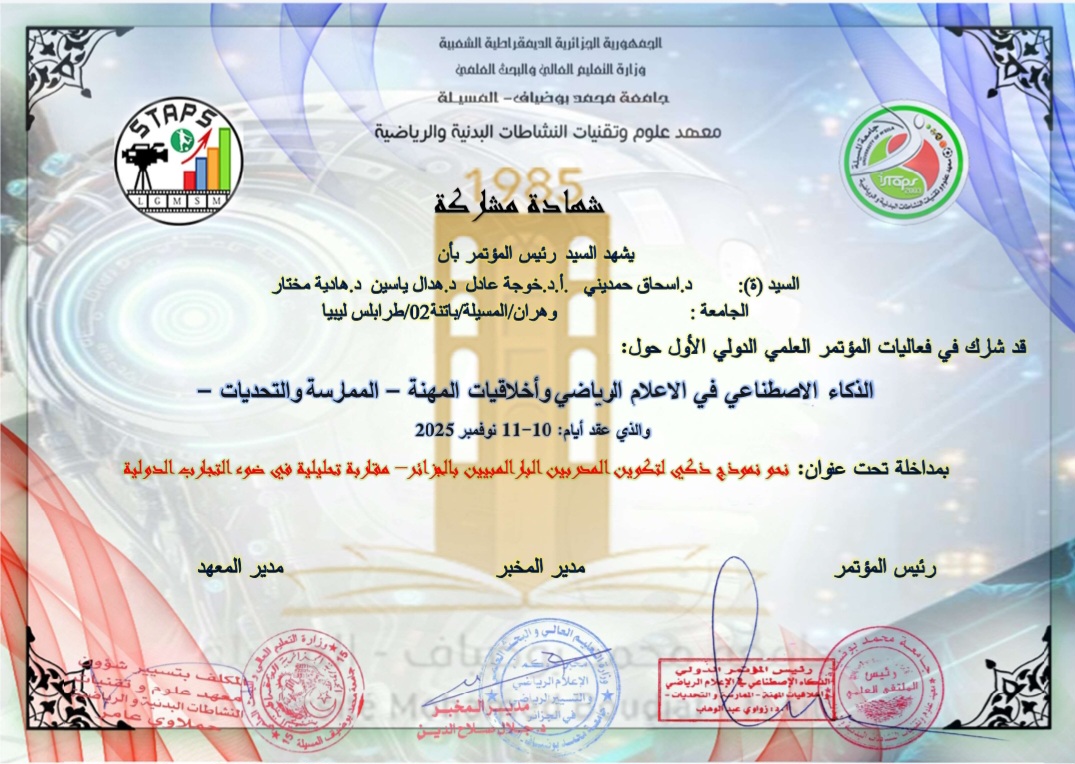 M. ADEL Khodja, (2025-11-10), "نحو نموذج ذكي لتكوين المدربين البارالمبيين بالجزائر- مقاربة تحليلية في ضوء التجارب الدولية", [international] الذكاء الإصطناعي في الإعلام الرياضي وأخلاقيات المهنة- الممارسات والتحديات , معهد علوم وتقنيات النشاطات البدنية والرياضية - جامعة المسيلة