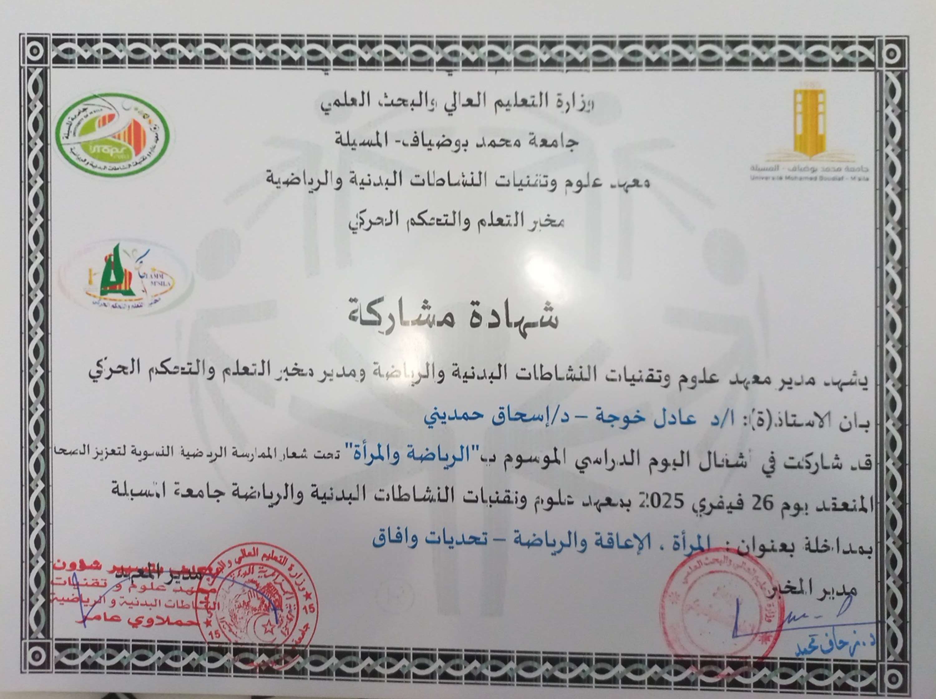 M. ADEL Khodja, (2025-02-26), "المرأة، الإعاقة والرياضة - تحديات وآفاق", [national] الرياضة والمرأة , معهد علوم وتقنيات النشاطات البدنية والرياضية - جامعة المسيلة