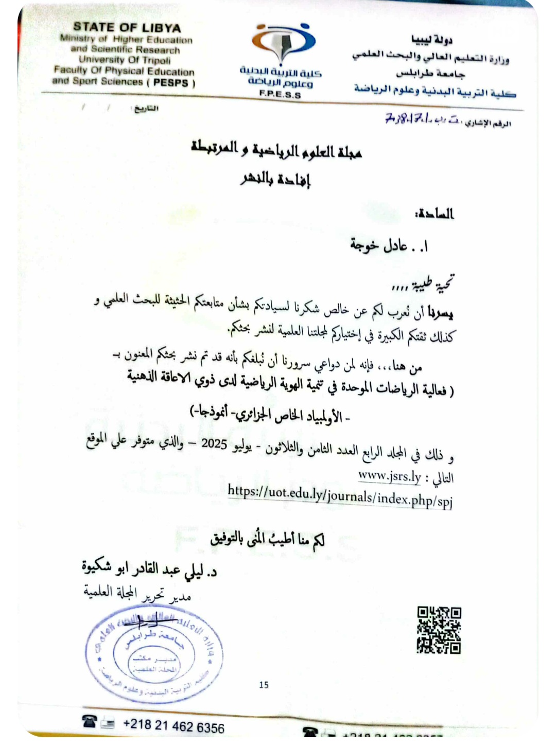 M. ADEL Khodja, (2025-07-01), "فعالية الرياضات الموحدة في تنمية الهوية الرياضية لدى ذوي الإعاقة الذهنية - الأولمبياد الخاص الجزائري انموذجا", [national] مجلة العلوم الرياضية والمرتبطة , كلية التربية البدنية وعلوم الرياضة جامعة طرابلس دولة ليبيا