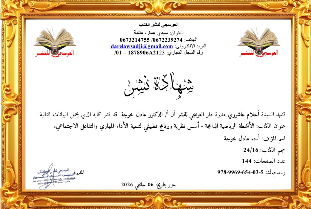 M. ADEL Khodja, (2026-01-06), "الأنشطة الرياضية الدامجة - أسس نظرية وبرنامج تطبيقي لتنمية الأداء المهاري والتفاعل الإجتماعي", [national] , العوسجي لنشر الكتاب