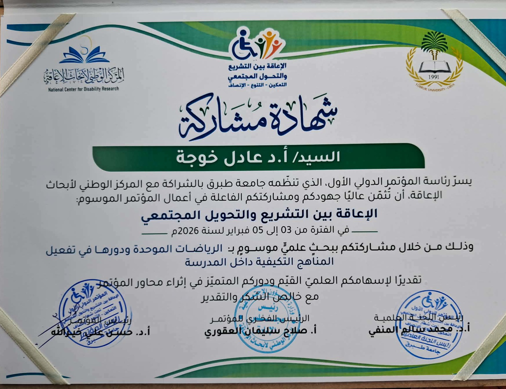 M. ADEL Khodja, (2026-05-30), "الرياضات الموحدة ودورها في تفعيل المناهج التكيفية داخل المدرسة", [international] الإعاقة بين التشريع والتحويل المجتمعي , جامعة طبرق دولة ليبيا