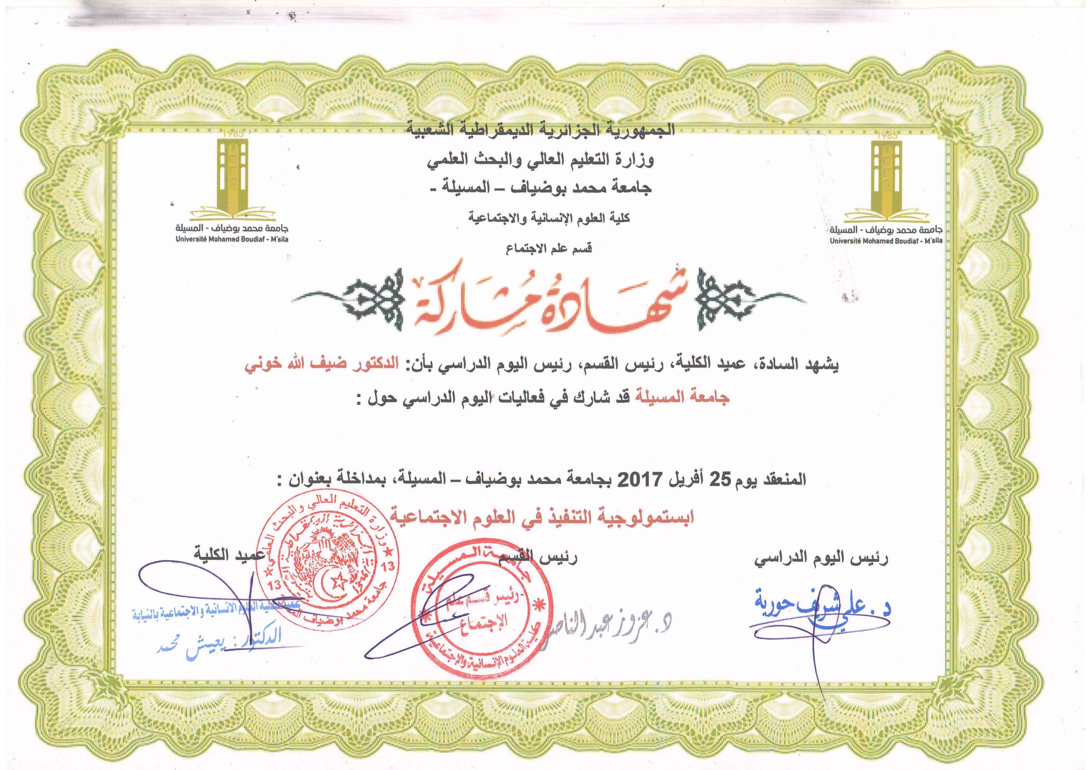 M. DIFFALAH Khaouni, (2017), "آفاق السوسيولوجية", [national] السوسيولوطية المغاربية بين الواقع والمأمول , جامعة المسيلة