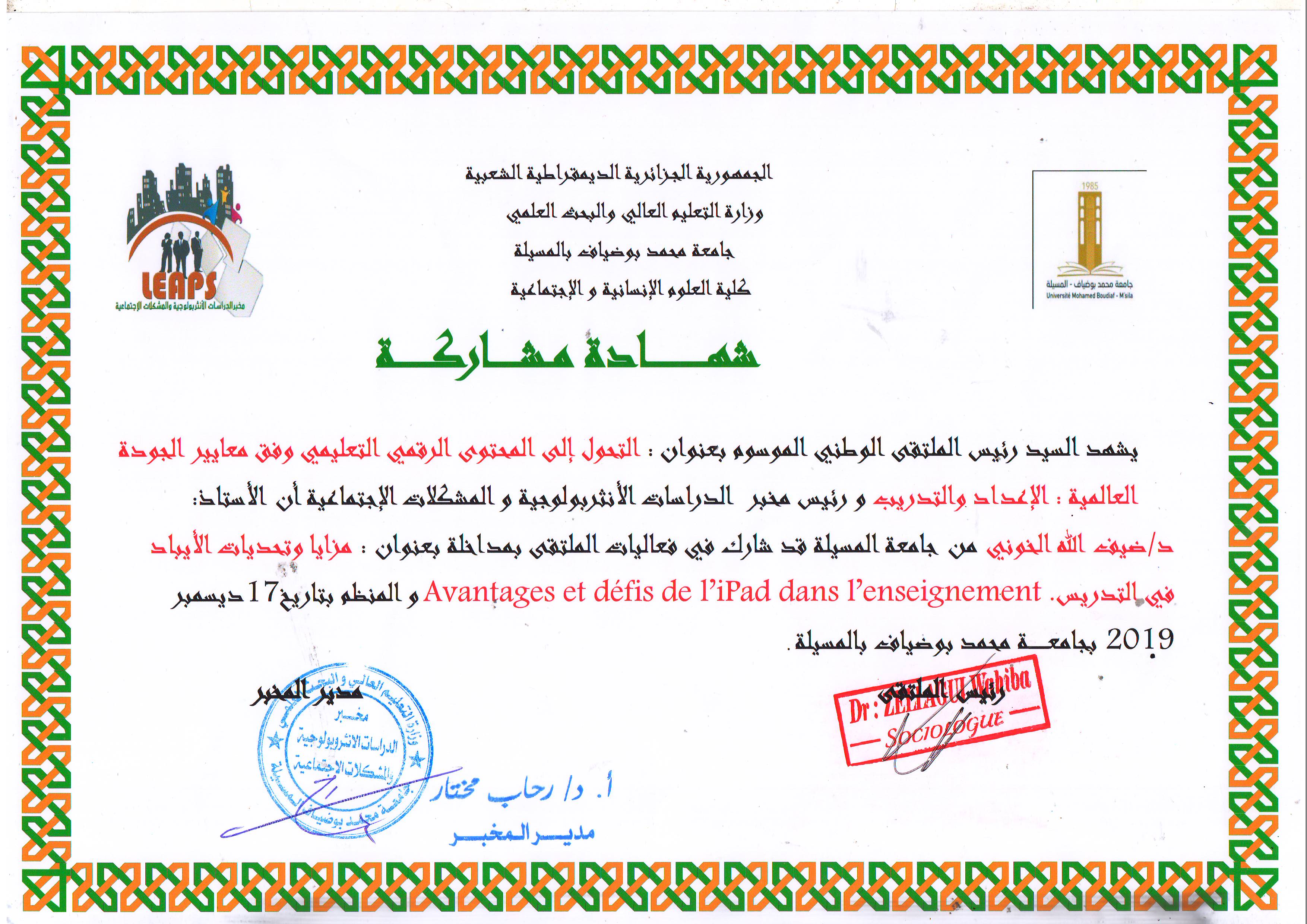 M. DIFFALAH Khaouni, (2019), "Avantages et défis de l'Ipad dans l'enseignement", [national] التحول الى المحتوى الرقمي التعليمي وفق معايير الجودة العالمية: الاعداد والتدريب , مخبر النتربولوجيا والمشكلات الاجتماعية. جامعة المسيلة